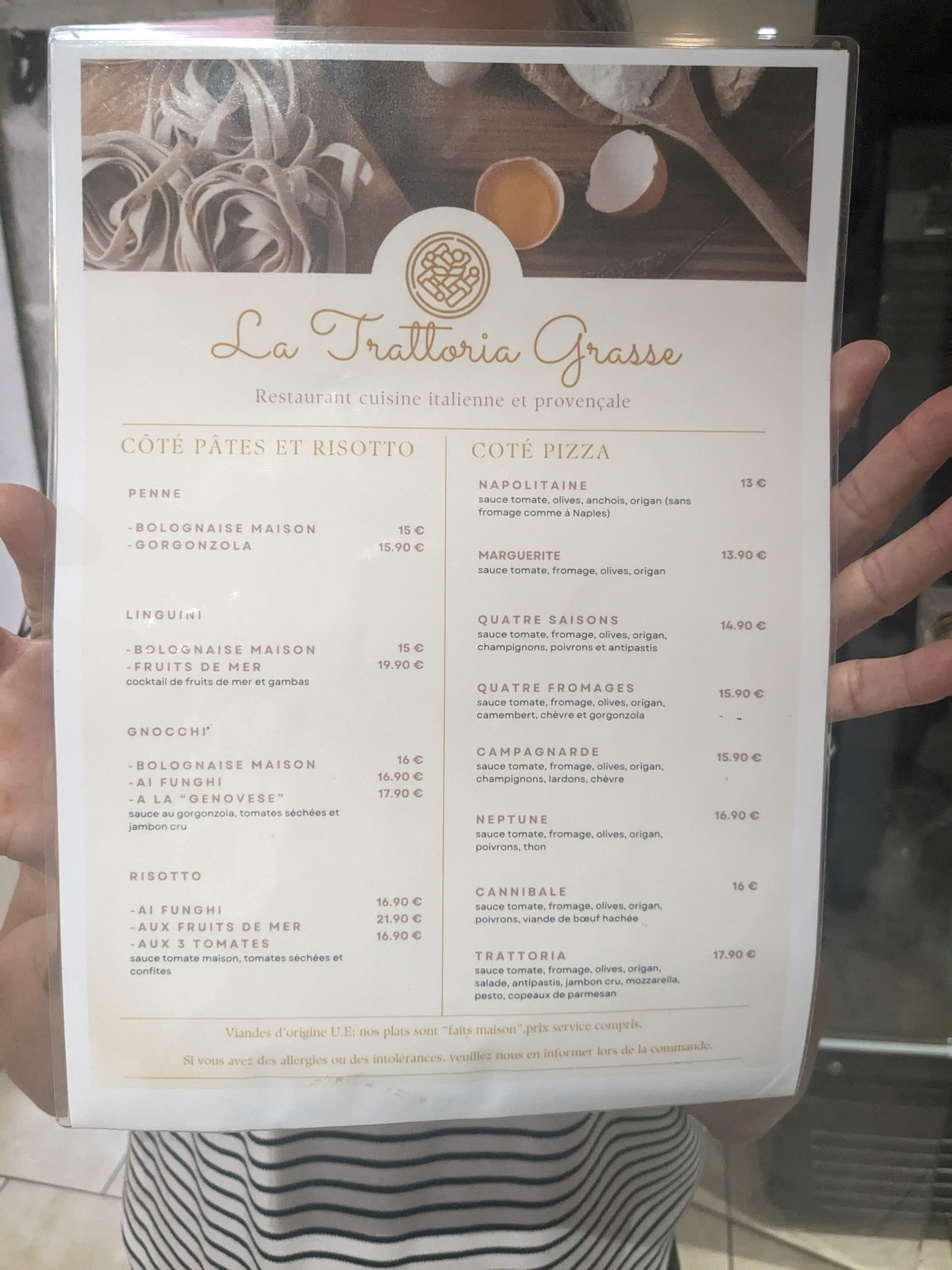 Super petit restaurant familial avec sa petite terrasse intime dans le coeur de ville de Grasse. Service très sympathique, personnel accessible et agréable.