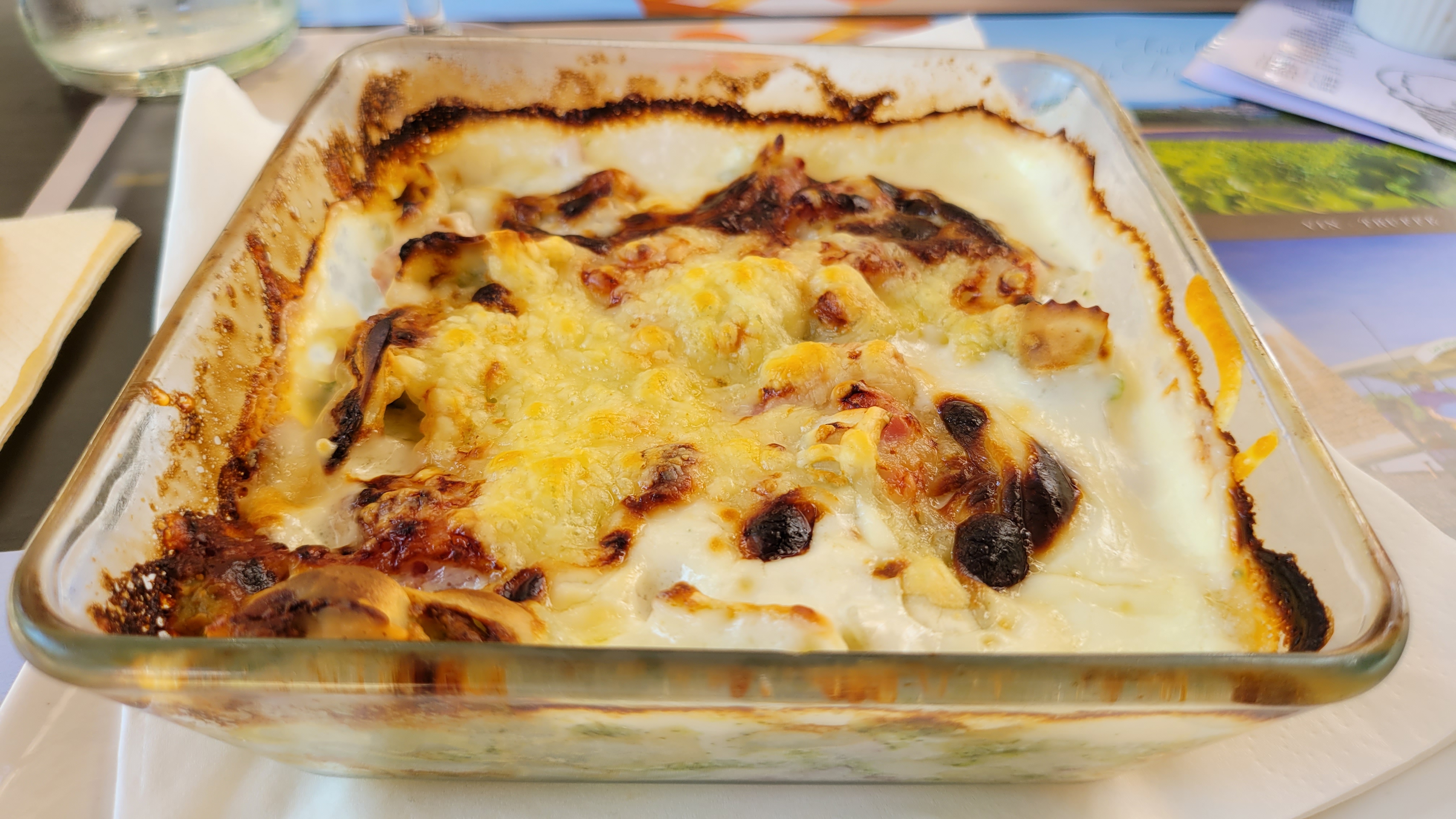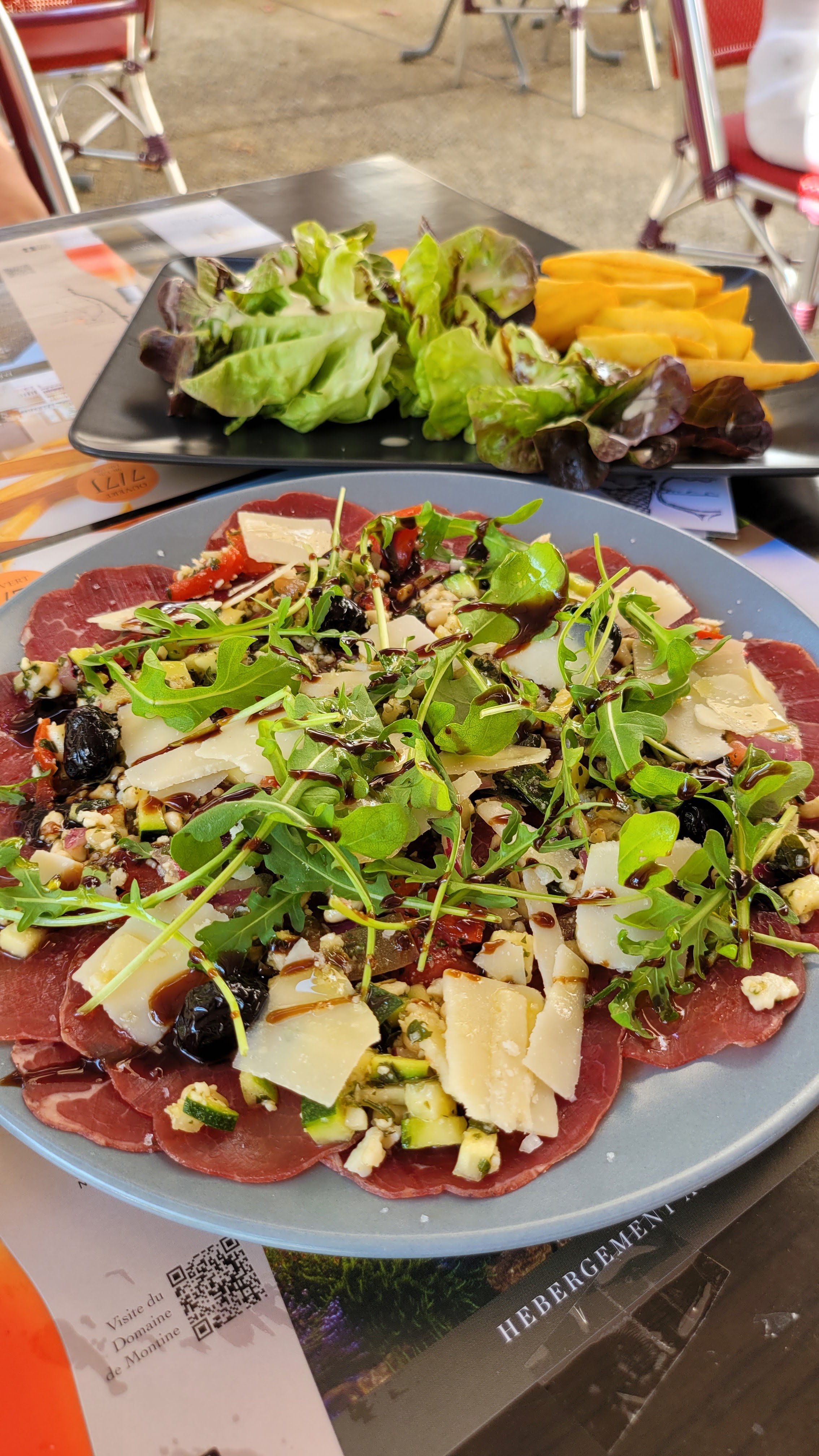 En cette chaude journée de juillet 2021, aussitôt installés à une table à l'ombre, la serveuse nous a apporté une carafe d'eau. Un bon point comme on disait dans le temps. Geste commerçant apprécié. Éloignez vous un peu de Grignan, sa foule et ses restaurants bondés et venez prendre place en terrasse à La Truffe Noire à Grillon. Au menu, ravioles gratinées, salades généreuses, carpaccio de Bresaola. Le tout servi sans trop d'attente. S'il vous reste une petite place, la carte des glaces vous attend.