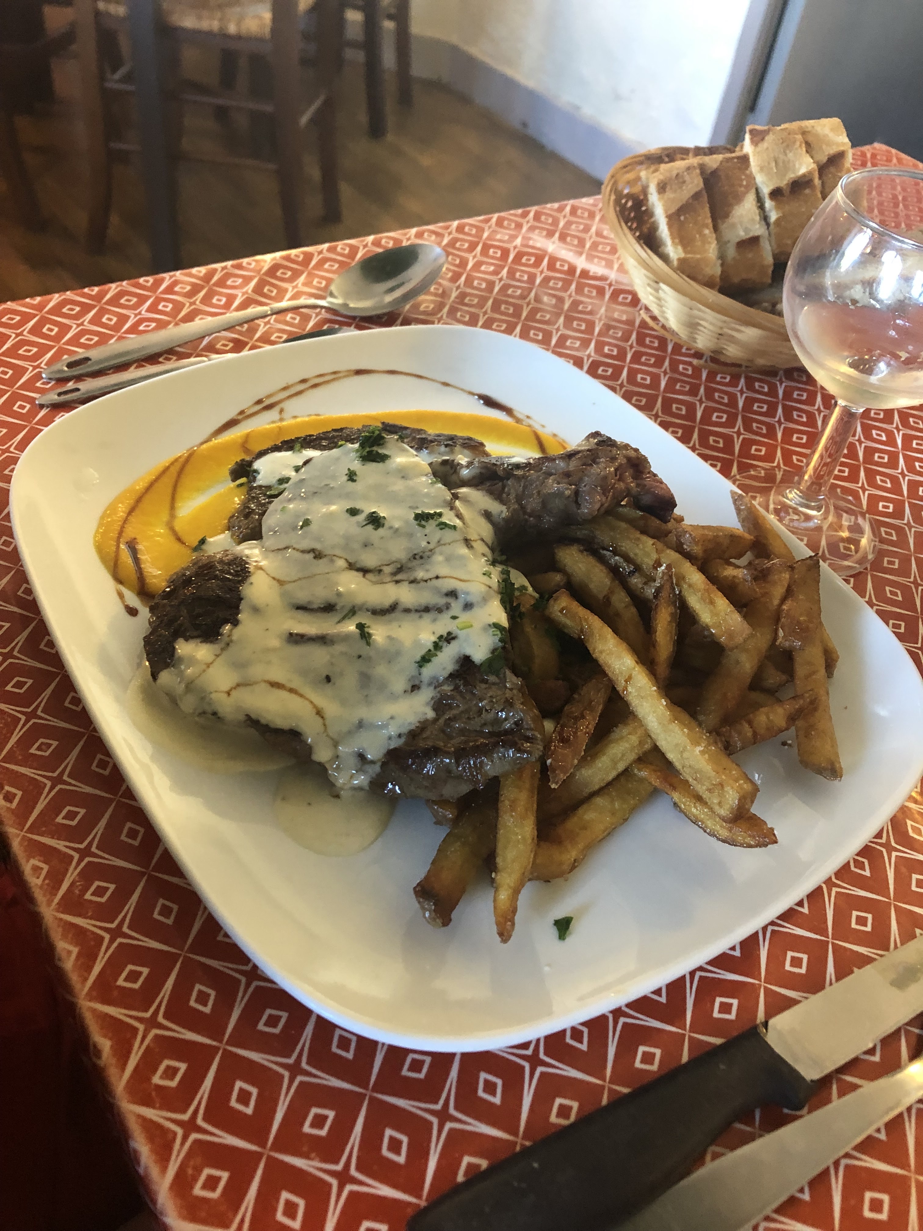 Le temps s'arrête un peu ici aussi, à la Vache qui Fume, où règne un bel esprit champêtre, et surtout, une cuisine délicieuse, aux produits frais et de saison. Notre mention spéciale au pavé saignant (d'une tendresse !) et sa sauce poivre (au goût de crème fraîche).. les burgers étaient délicieux, le pain croustillant du début à la fin.. pour finir par (vraiment) tomber dans le Trou Corrézien 😅