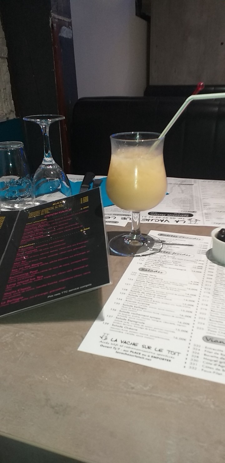 Accueil décontracté. Déco sympa (rue un peu bruyante lorsqu'on mange en terrasse en été). Carte très variée, chacun trouvera son bonheur. J'avais un peu peur qu'entre les pizzas, les pâtes, les moules, les grillades et les salades, ce restaurant ne maîtrise véritablement aucune recette mais en fait, après 2 dîners à La Vache sur le Toit, nous sommes ressortis contents et repus. Les salades sont copieuses, les grillades servies à la cuisson demandée, les pizzas généreuses, les moules bien cuisinées, les desserts maison réussis. Le service est peut-être un peu long (il manquerait 1 personne supplémentaire...), mais nous étions en vacances, donc, pas pressés...! Le menu à 20€ est parfait, celui à 25€ très bien aussi. Le petit plus: 2 limocello offerts à la fin de notre dîner... Sympa! Pour conclure: un resto sympa pour dîner en famille ou entre amis sur un mode décontracté et gourmand.