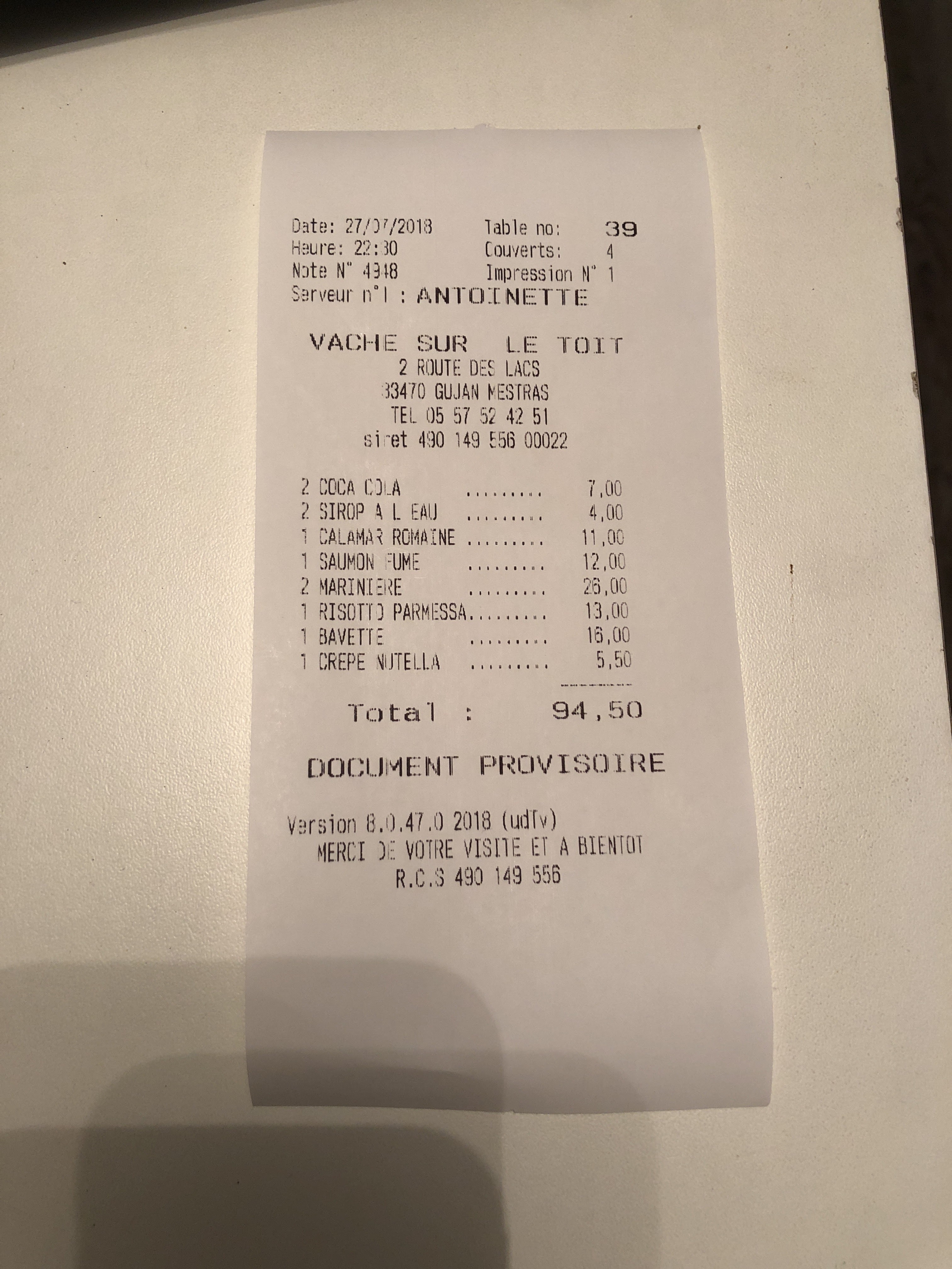 Repas correct sans plus. pizza aussi. délai entre les plats trop long. Servi en décalé avec les enfants et ma femme. Toilettes peu propre côté homme, pas de savon pour les mains... et pas de rince doigts qd on mange des fruits de mer. Café sans goût. En résumé est ce que la vache y est sur le toit ?