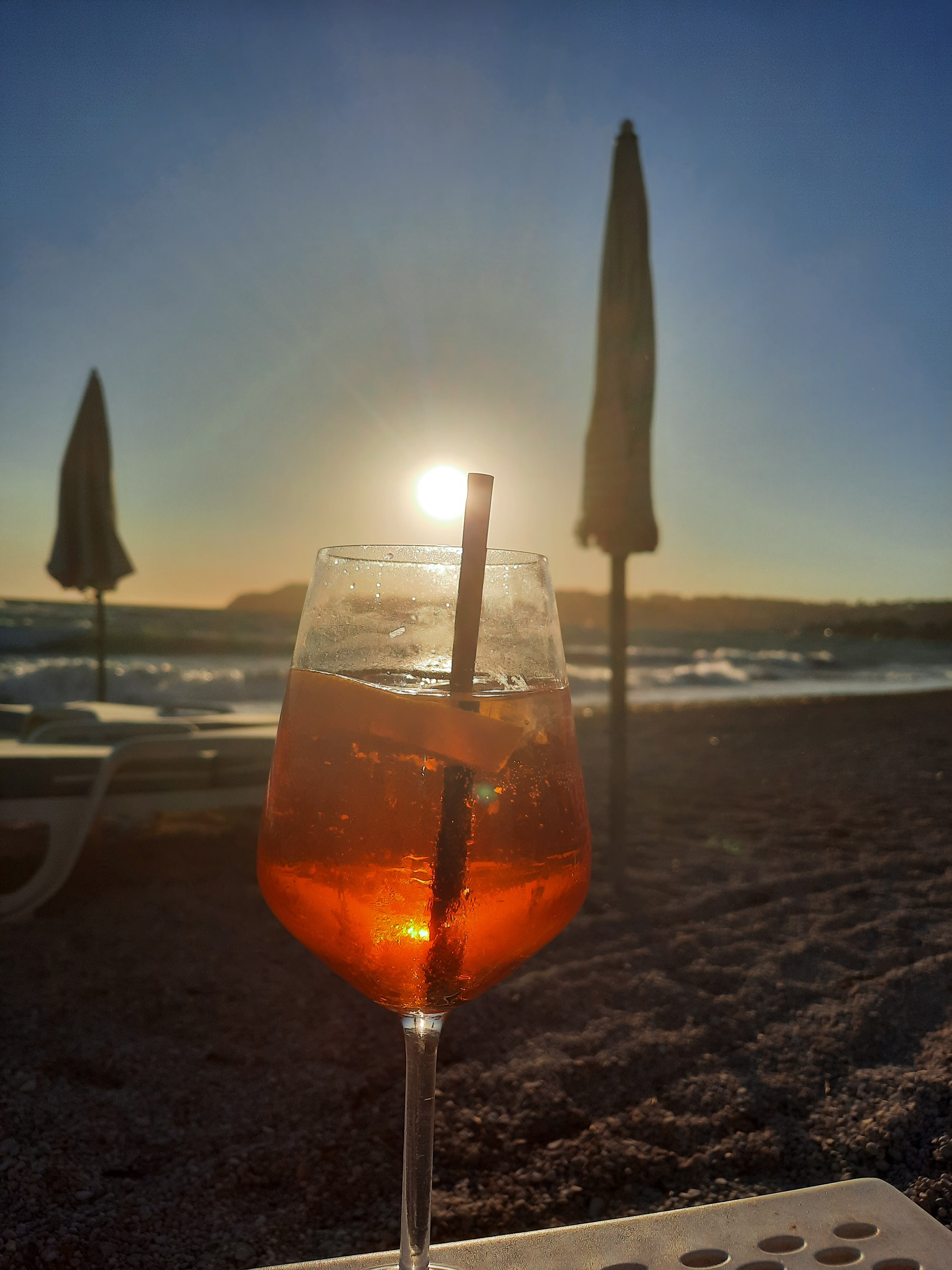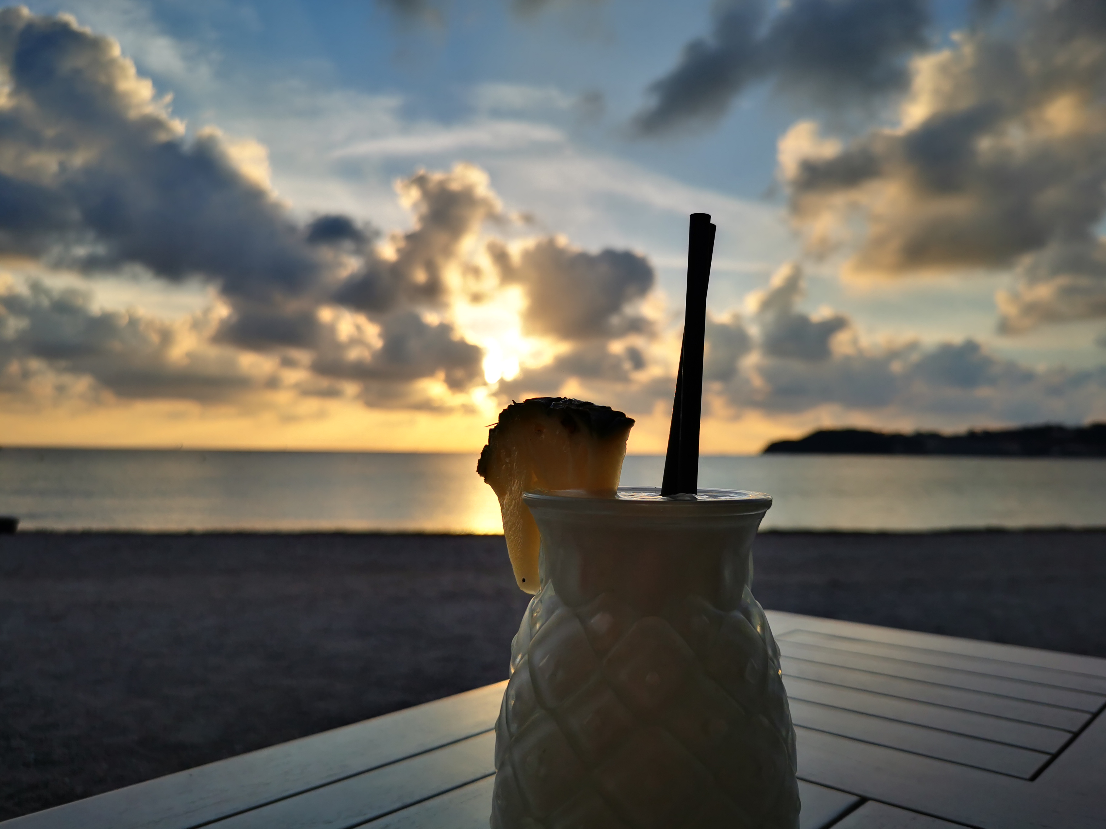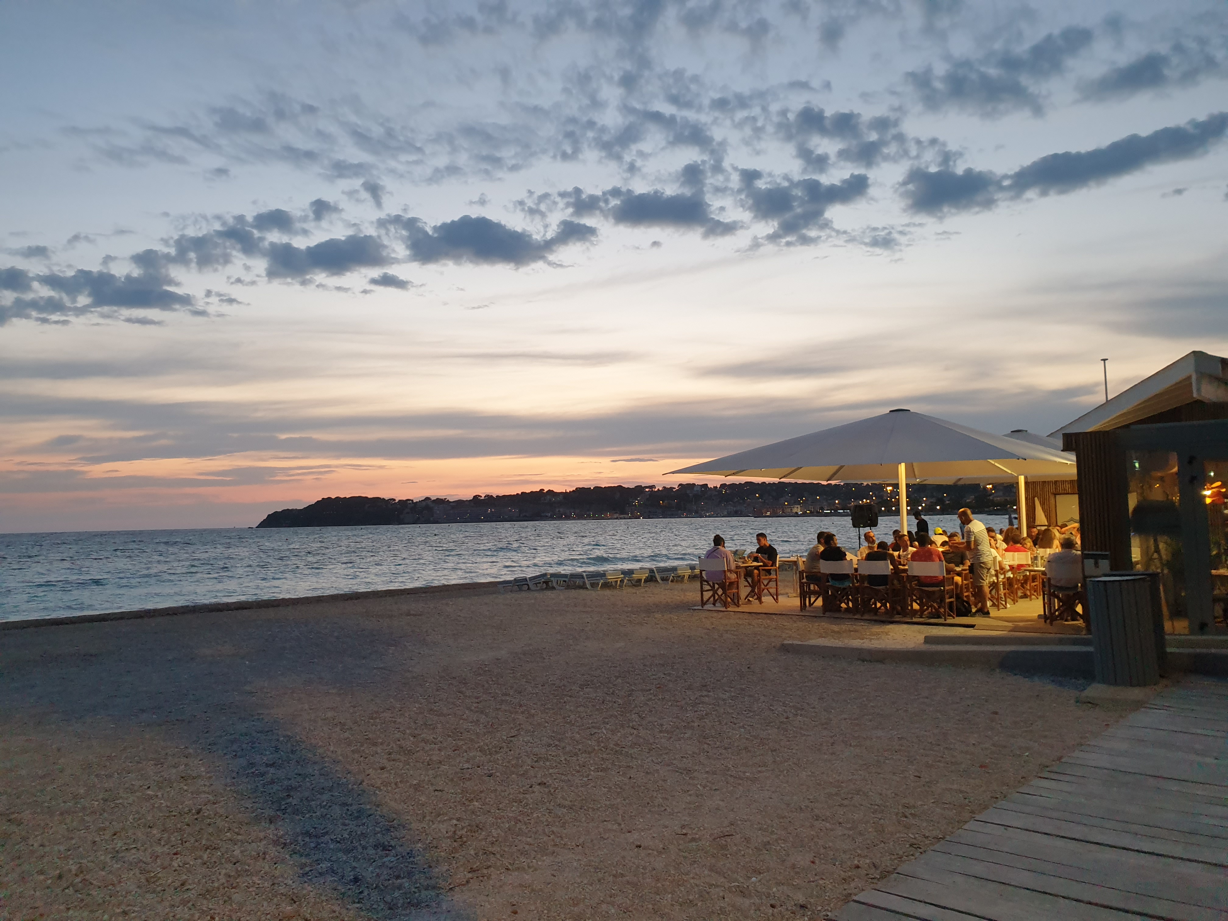 Nous nous sommes installés sur les transats du restaurant afin d’y apprécier un verre de rosé devant le coucher du soleil. Vue exceptionnel et la nourriture (même sans l’avoir gouté) avait l’air d’être de qualité.