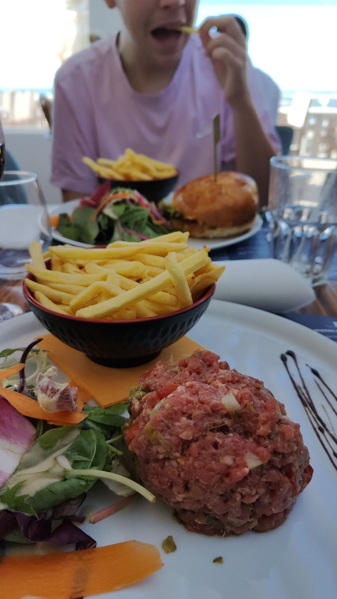 On a mangé dehors sur la terrasse au soleil avec la mer à côté, un vrai plaisir.! Le service est super et efficace. On a pris une planche de charcuterie/fromage très bien servie et délicieuse et une pièce du boucher cuite comme demandé et succulente . Je recommande vivement 👍