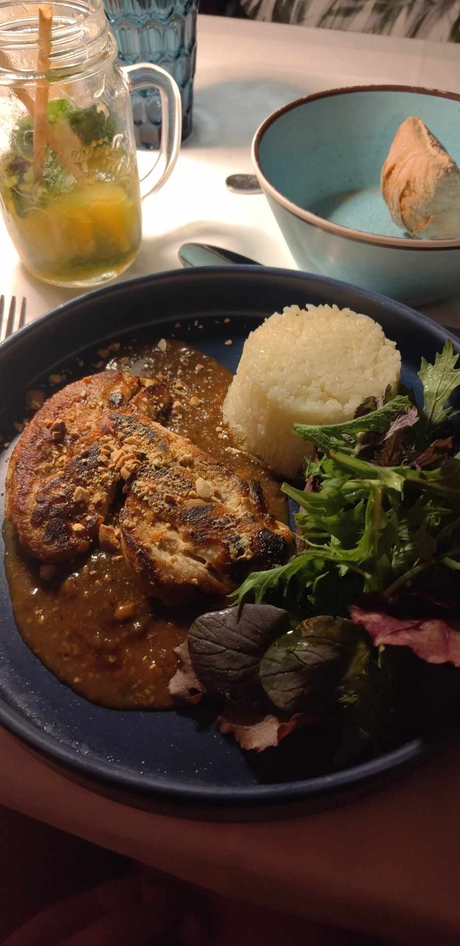 Nous sommes allés en soirée et avons commandé le même plat Un poulet noix de cajou avec riz Thai. Plat très bon en goût, nous l'avons avalé assez rapidement, mais en comparant le reste des plats, les prix et l'environnement, c'était un des plats le moins cher (19€). Le service était un peu lent malgré le peu de clients, mais une fête privée avait lieu avec pas mal de monde, les serveurs étaient tout de même sympathiques. L'environnement est cosy avec l'ambiance lumière et vue direct sur la plage.
