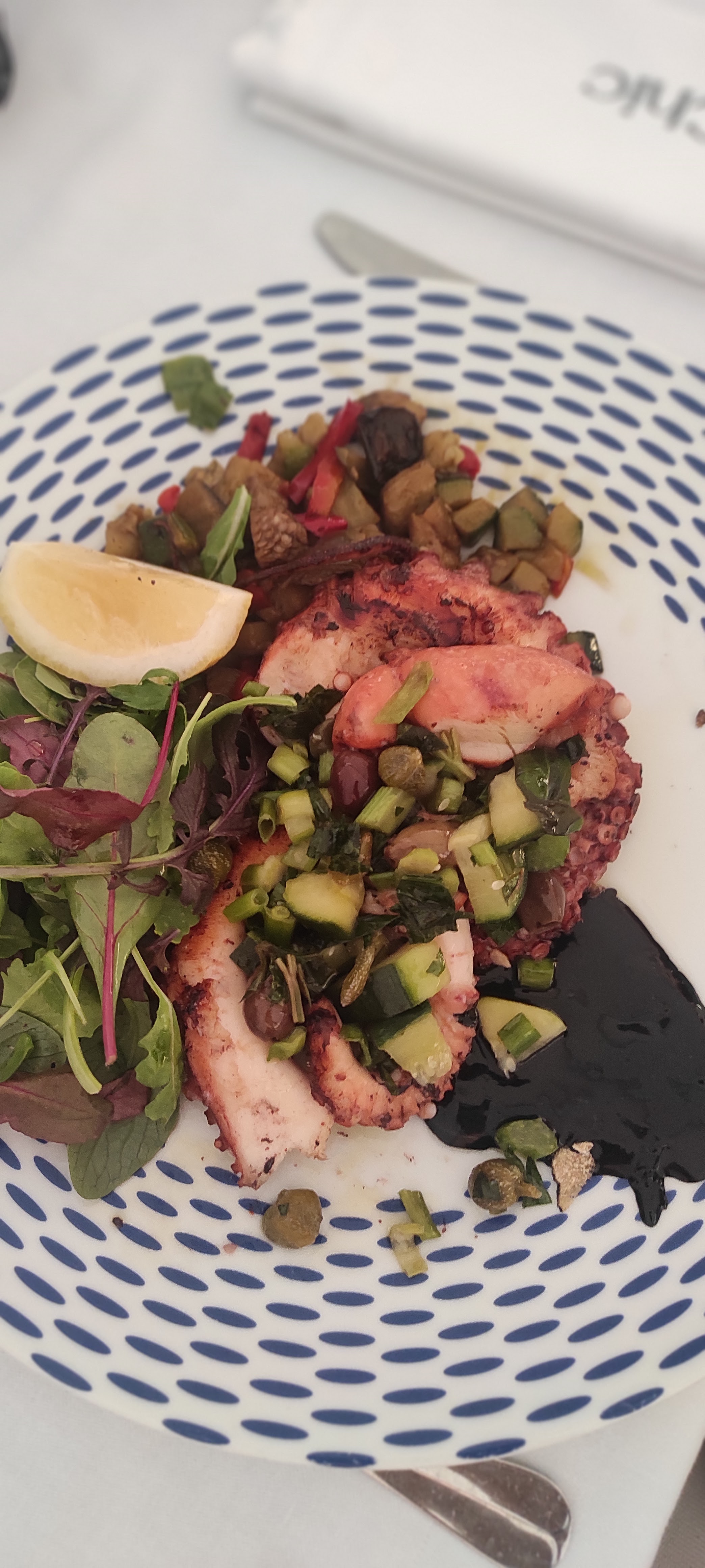 Un moment parfait auprès de vous. Nous vous remercions d’avoir accueilli notre chien en extérieur. Le cadre est juste idyllique en face de la mer, avec une belle tablée. La cuisine et ce fameux poulpe grillé furent exquis: différentes saveurs, textures , présentation!!! Et le service était à l’image de la cuisine. Bravo à toute l’équipe!
