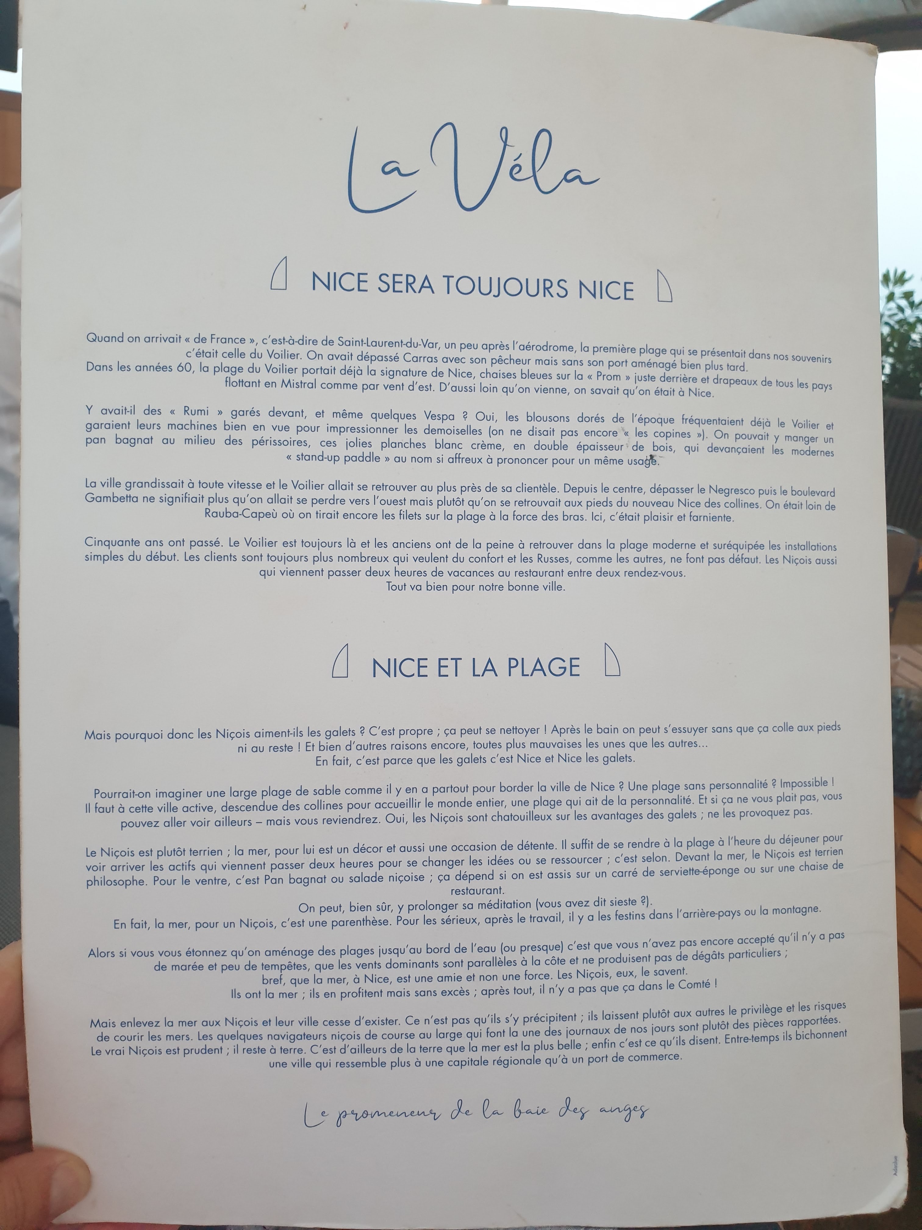 Nous sommes restés dix jours à Nice et pratiquement tous passés à la plage privée du restaurant la Vela. J'étais parti pour mettre un 5 étoiles malgré les prix assez excessifs, car les serveurs sont excellents et le lieu magique. Mais par trois fois les factures ne correspondaient pas à ce que nous avions pris. Aussi bien au restaurant que sur la plage. Aussi je n'ai qu'un conseil à vous donner, vérifiez votre facture pour voir s'ils ne vous ont pas rajouté deux ou trois plats que vous n'auriez pas consommé