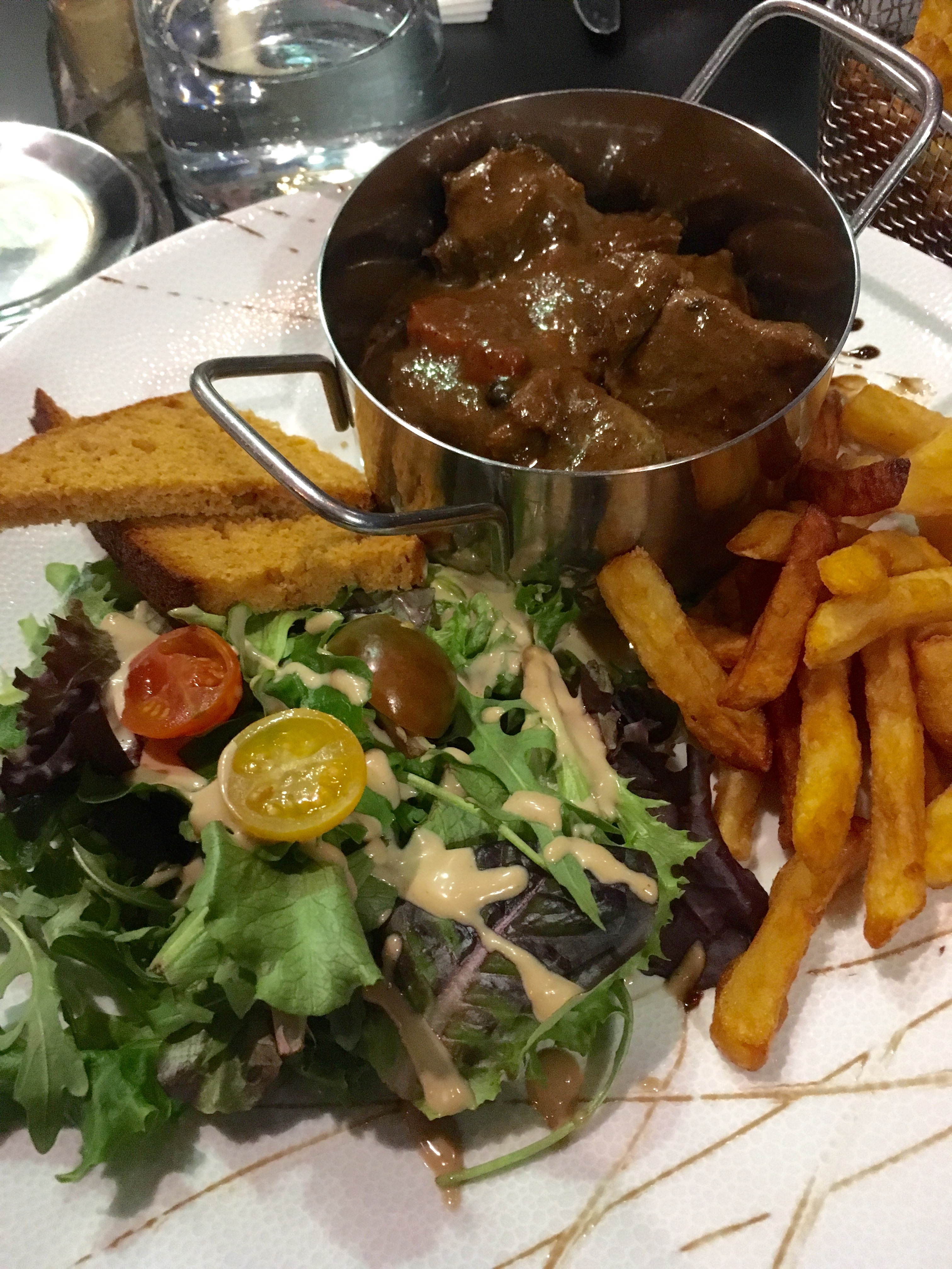 Restaurant bien parfaitement isolé dans le centre ville. Cadre et atmosphère très sympathique. La musique rend l'endroit assez dynamique j'ai bien aimé. Le repas choisi : Carbonnade de Ché Mi Une carbonade flamande hyper délicieux et bien savoureux. Je vous le conseille fortement.