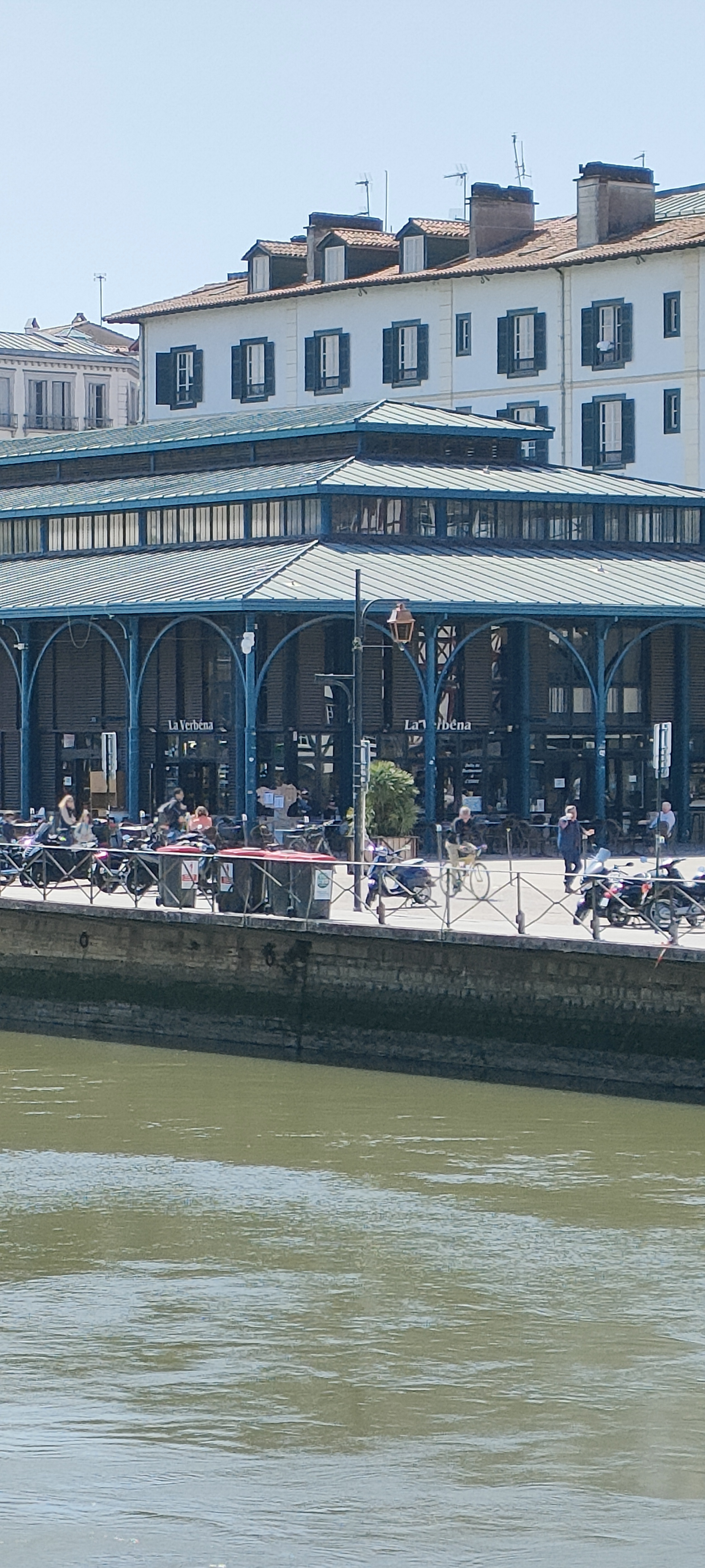 Terrasse donnant vue sur la Nive et carreaux des halles agréable par beau temps