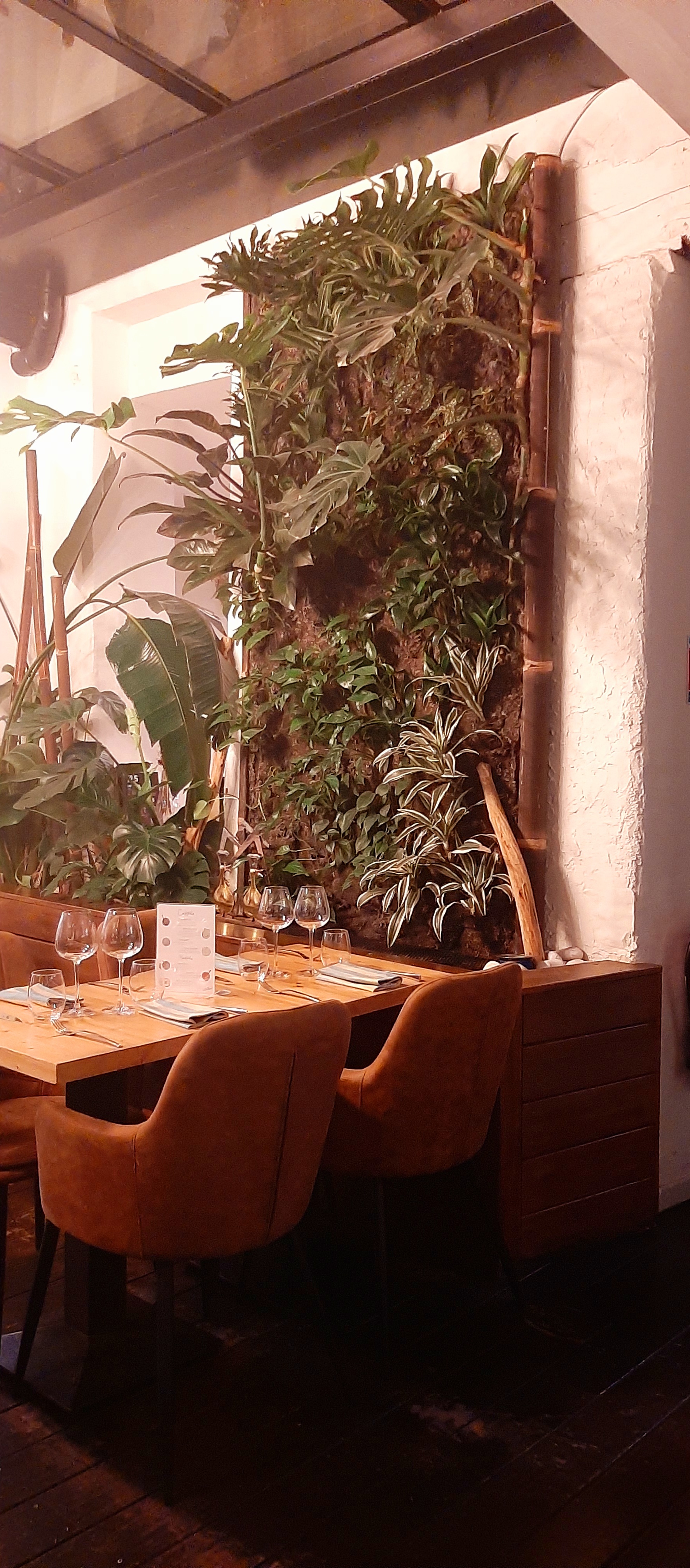 Très belle salle lumineuse sous la verrière avec mur végétal du plus bel effet, la vision sur la cuisine et les plats en preparation contribuant à la mise en appétit. Le repas nous a vraiment plu, nous avons pris le menu découverte en 5 plats et de l'entrée au dessert chaque met était fin délicat et plein de saveurs...on reviendra certainement. Un peu d'attente entre chaque étape, à savoir mais pas trop dérangeant pour nous qui avions le temps. Merci !