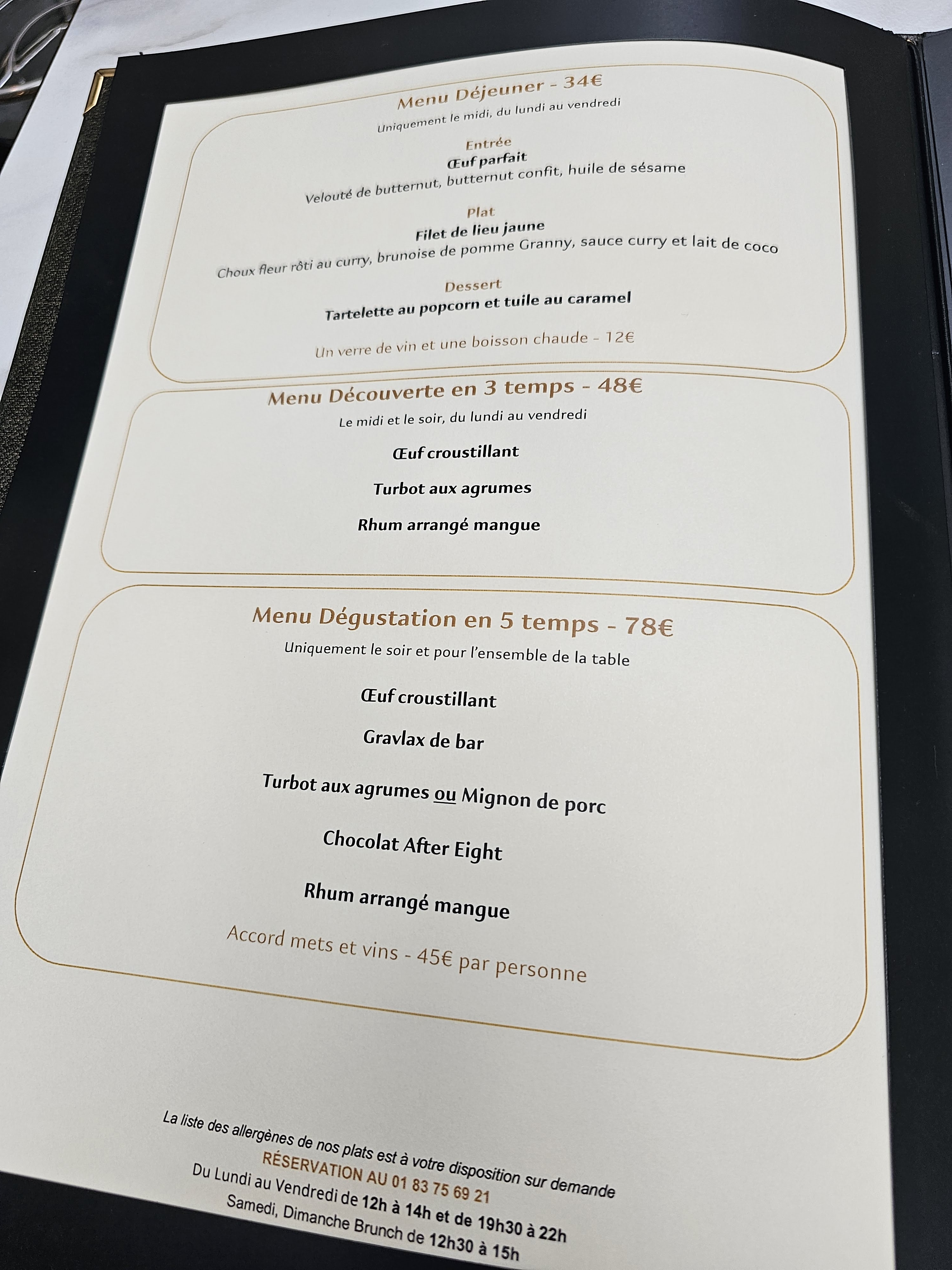 Accueil et service adorables, très sympathique et courtois. Très belle salle, confortable. Pourquoi regrouper tous les clients dans la moitié de la salle et ne pas répartir sur l'ensemble de la salle plutôt que de laisser l'autre moitié totalement vide ??? Cuisine très savoureuse, belle présentation, moderne et colorée. Mets de qualité avec des saveurs bien maitrisées, une cuisson parfaite, mélange de textures, assaisonnement agréable, fusion asiatique légère. Excellente qualité des viandes et poissons. La lotte, fantastique. Jolie présentation. Pain chaud avec du bon beurre. Bordier peut-être ? On regrette de retrouver dans tous les plats, entrée, plat et dessert, des petites graines de sarrasins soufflées. Pas nécessairement très agréable en bouche et goût. Desserts moins bien aboutis. Visuel et goûts. Attention, le chocolat est bon mais la confiture d'amarena apporte beaucoup trop de sucre. Très bonne cave avec un joli choix de très bon vin au verre. Un peu surpris par le système de prix. Toutes les entrées, les plats et les desserts au même prix. C'est un peu surprenant. Au final c'est raisonnable. Prix qualité acceptable. Belle soirée, moment sympathique, confortable et particulièrement bien accompagné par un personnel de salle qui se donne de la peine. Merci à l'équipe et à la Cheffe bretonne. On reviendra !