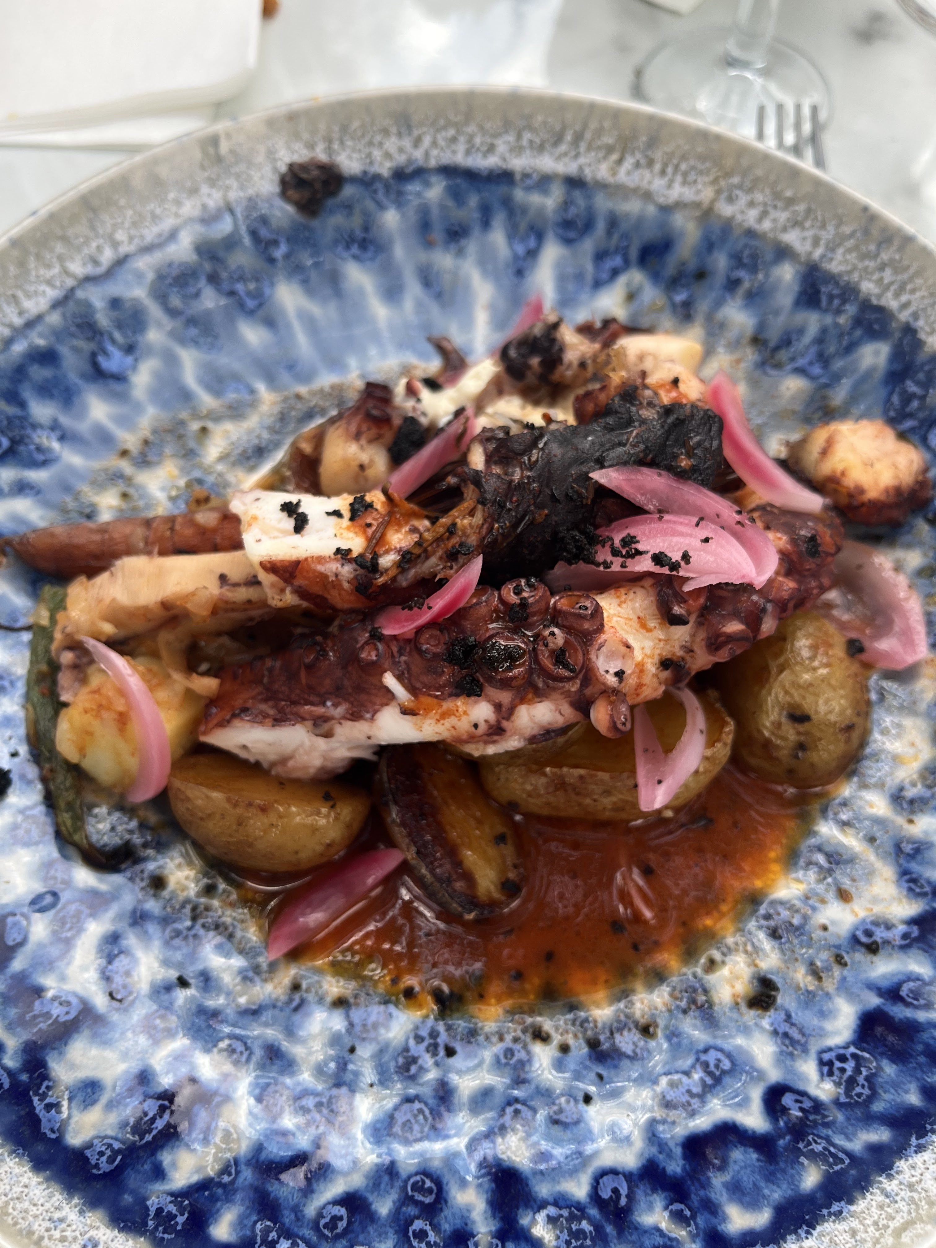Un endroit à éviter au plus haut point : -Thé glace MAISON: 4€ = ice tea 33cl -Buratta à la truffe, asperge grillée avec tomate : 17€ = pas de truffe dans la burrata, pas d’asperge. Soit une tomate mozza. -Bien évidement nous ne somme pas avertis lors de la prise de commande. -Couverts sales. -Poulpe pour 1 personne :25€ beaucoup trop cuit à la limite de la semelle de chaussure. Évidement aucune remise commercial ainsi qu’aucune implication des responsables à notre égard. Malgré tout ces points négatifs (signalé au personnel) qui nous faisait sentir que notre présence n’était pas la bienvenue, quelques personnes ce sont senti concernés, serveur(se), mais pas tous. C’est très dommage étant donner le potentiel énorme du cadre très agréable.