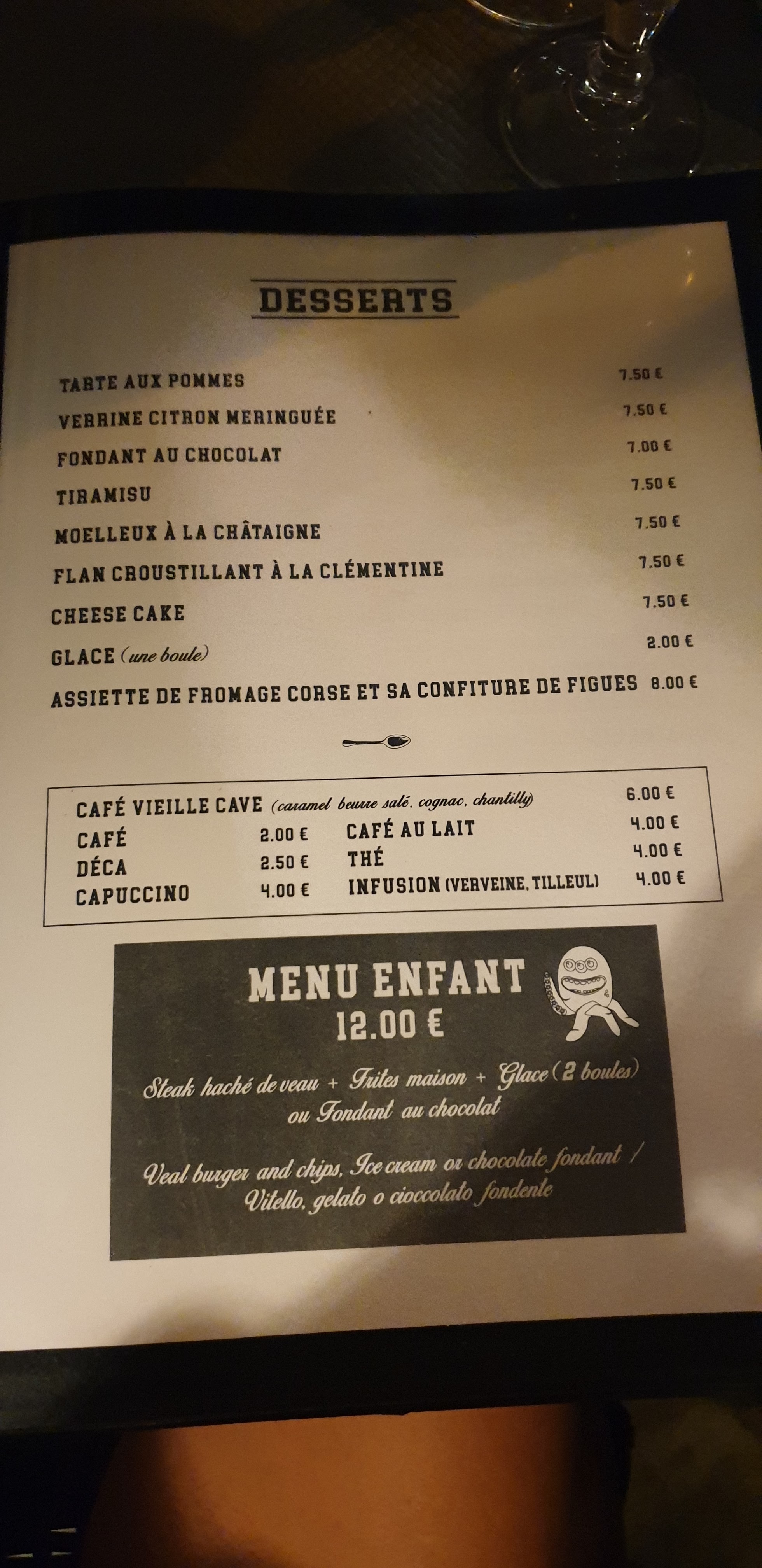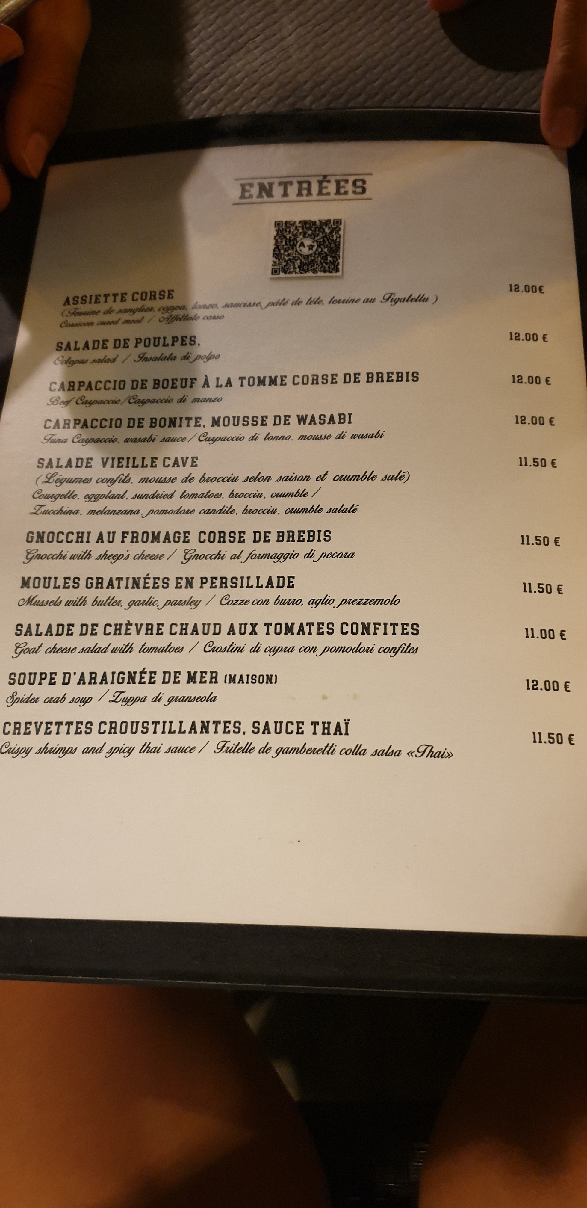 Une super adresse !!! Rapport qualité prix excellent. Apres plusieurs déceptions et m'esaventures culinaire et gastronomique en Corse, nous repartons heureux et satisfait de notre dernier restaurant à La Vieille Cave. Menu à 30e complet, copieux avec un choix intéressant et des saveurs pleins la bouche....! Service professionnels et sympathique. On y reviendra.
