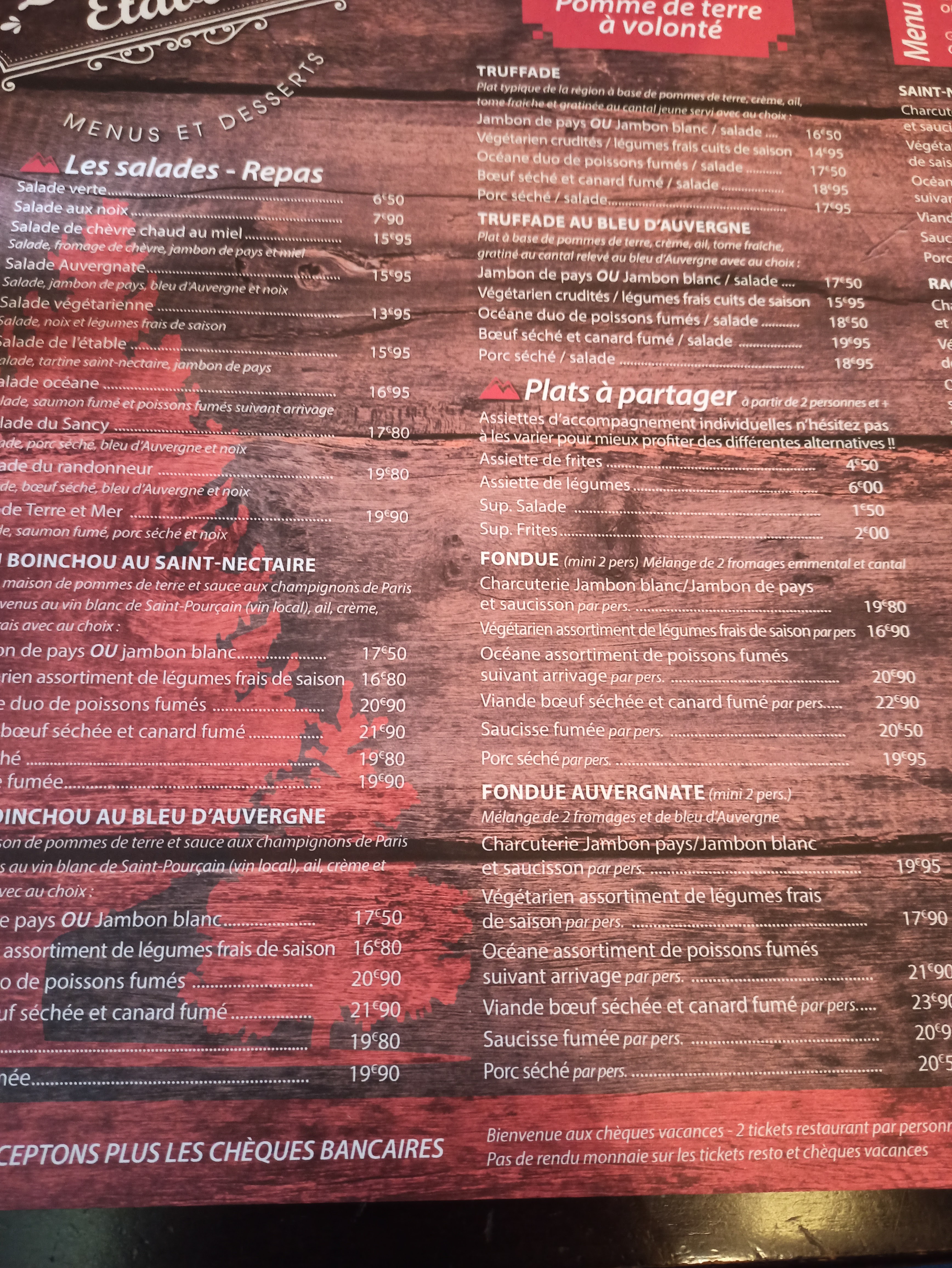 Cuisine médiocre : truffade qui était en réalité un gratin dauphinois, fondue en sachet, desserts vendus maison mais gros doute Avec 3 services le soir, on voit qu'on veut faire du pognon ici au détriment de la qualité dans les assiettes Attrape touriste, svp respectez les clients et la cuisine française !