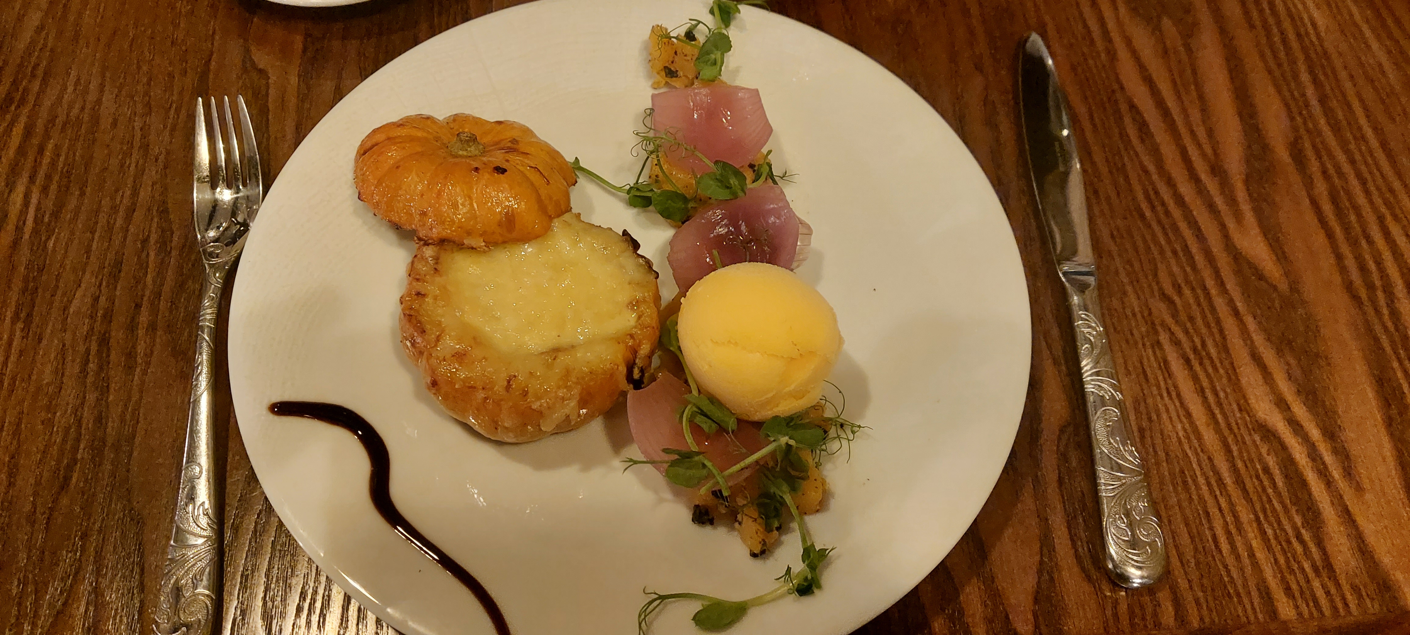 Menu d'automne et menu la vieille forge 4 personnes. Très bon accueil et dispositions Covid bien respectées. Champagne de bonne qualité. Après concertation avec mes invités, repas excellent avec une petite réserve concernant le magret farci et foie gras mi-cuit servis un peu froid à notre goût. Idem pour l'amandine. Un grand bravo à toute l'équipe et nous vous recommandons très vivement ce beau restaurant. Très satisfait d'avoir fait une étape ici.Bon rapport qualité/prix.