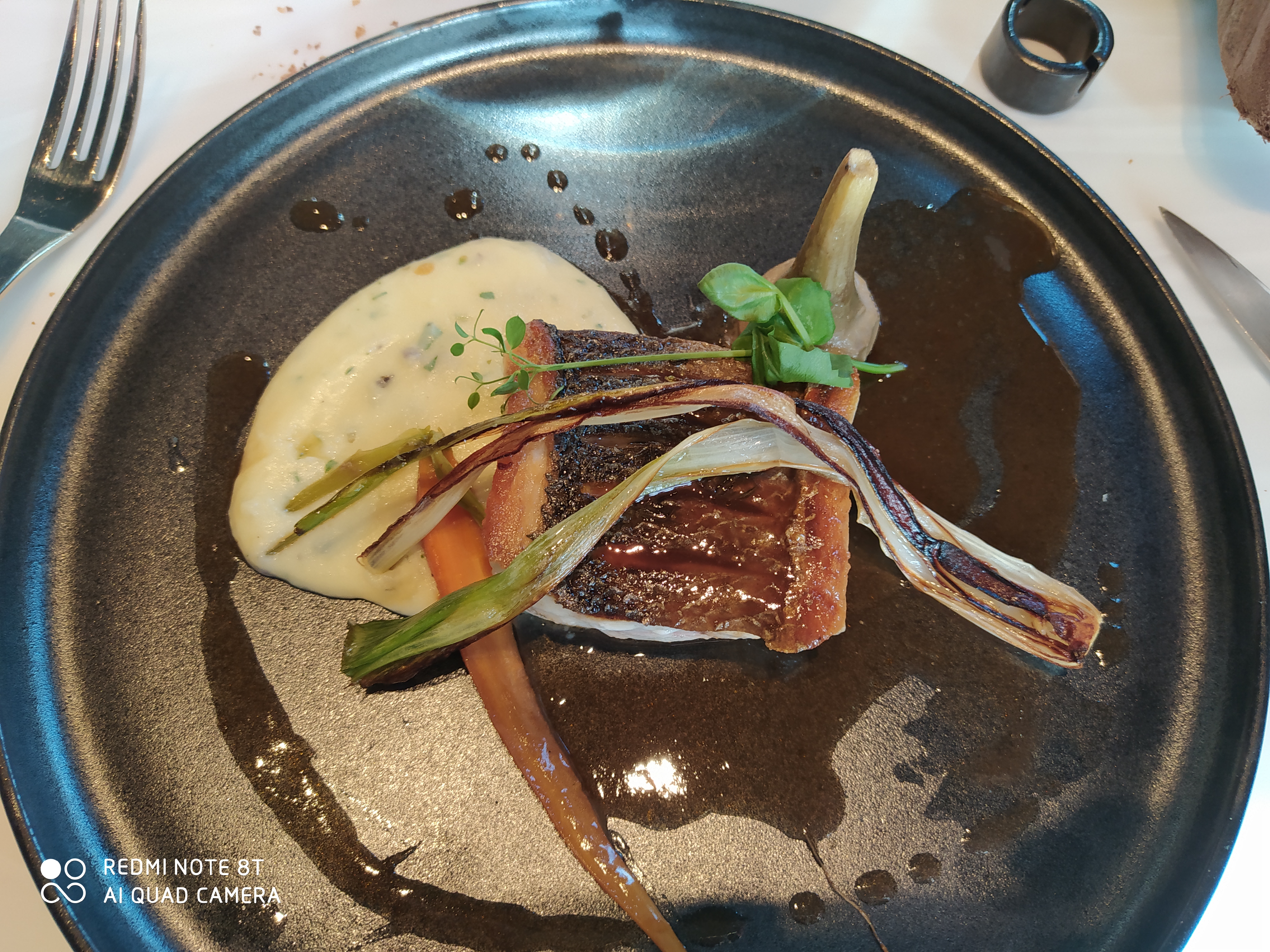 Je n'étais pas venu depuis plusieurs années. La façade a changé, mais aussi l'ambiance dns le restaurant. La salle est claire et lumineuse. Notre table donnait sur la rue, donc avec une vue sur la vieille tour et le Légué à marée haute. Magnifique. Nous avons choisi deux menus à 60 euros, donc Entrée + Plat =+ Fromage + Dessert. En entrée Foie gras et Saint-Jacques snackée. Pas de surprise, c'est bon. Ah si! Les deux beurres Bordier: Au piment d'Espelette, et l'autre plus classique le demi-sel. Pas besoin de réclamer une lichette de beurre, ici, on en a du bon et en quantité largement suffisante pour tout le repas. Différents pains et de qualité. En plat: Du cabillaud basse température avec une cuisson à tomber pare terre... Par contre je n'ai pas vu l'intérêt de la clémentine brûlée ( mais c'est personnel). Le deuxième plat, du bar. poëlé; mon épouse m'a annoncé: Très très bon. je ne peux donc que la croire. Un regret: Nous aurions préféré que le Ménetout Salon reste sur la table car il nous a semblé trop froid pour dégager tous ses arômes. Par contre, j'ai vraiment apprécié que le couteau soit un vrai couteau, et non pas un couteau à poisson dont personne ne sait comment l'utiliser surtout les gauchers. Pour le fromage, une assiette simple et bonne. Au dessert, un citron confit pour moi, et un soufflé crémeux mangue passion pour mon épouse. un régal. Bref, nous avons passé un excellent moment, servis par une personnel discret mais attentif et à l'écoute. C'était la semaine dernière, mais ce cabillaud, je m'en souviens encore....