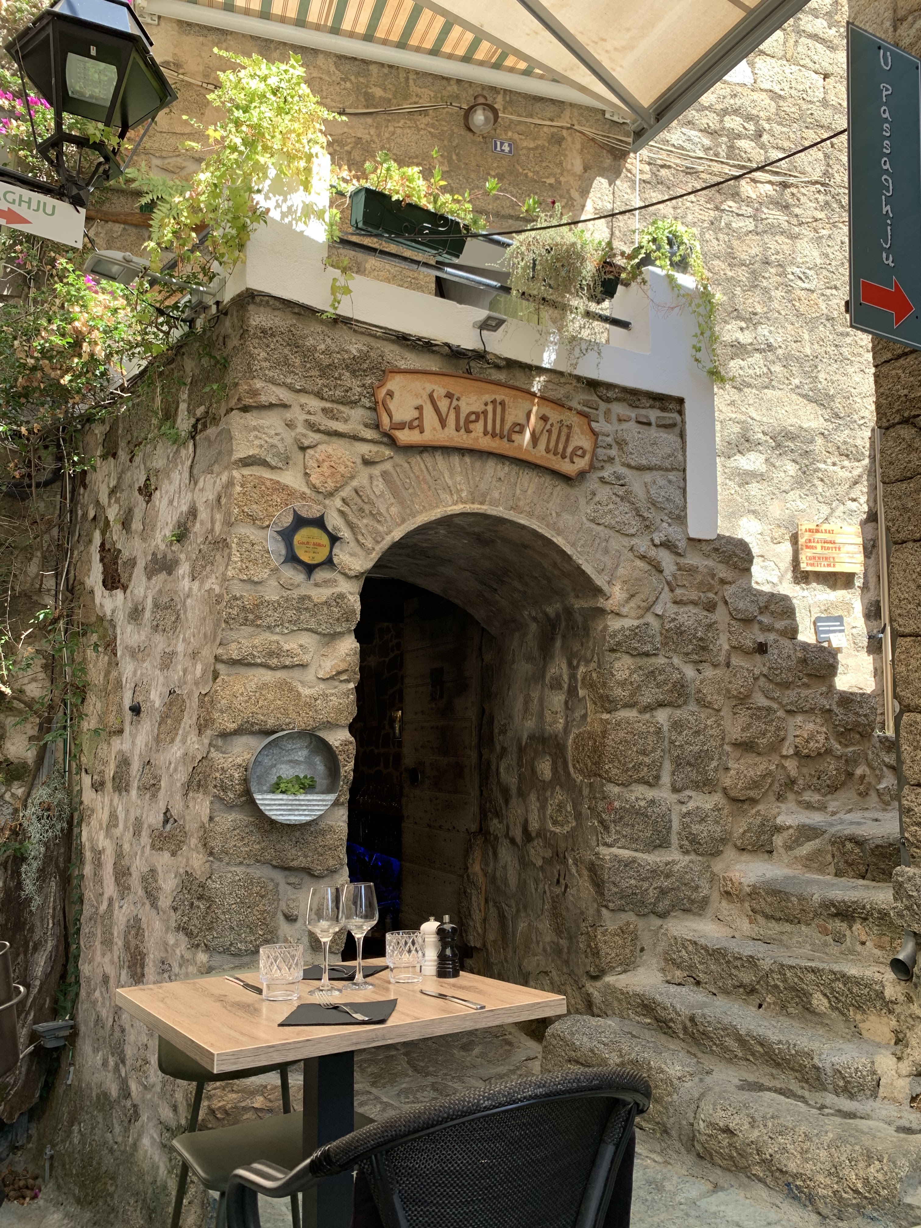Très bon petit restaurant au fond de l’impasse. Il s’y dresse dans une vielle maison typique de Sartene, toute en pierre et en étages. Mais les tables sont surtout dans tout le fond de l’impasse. De quoi trouver son bonheur, à 2 au moins. Facile de faire du piège à touristes, mais ici que de la cuisine fraîche, bien réalisée et locale. Nous avions pris les légumes farcis et le plat de poulpe. Les deux étaient très bons et la cuisine faite sur place. Le tout avec un service très sympathique assuré par Margaux (ou Margot) et Nicolas. Allez y direct c’est une belle table, simple et pleine de (bon) goûts.