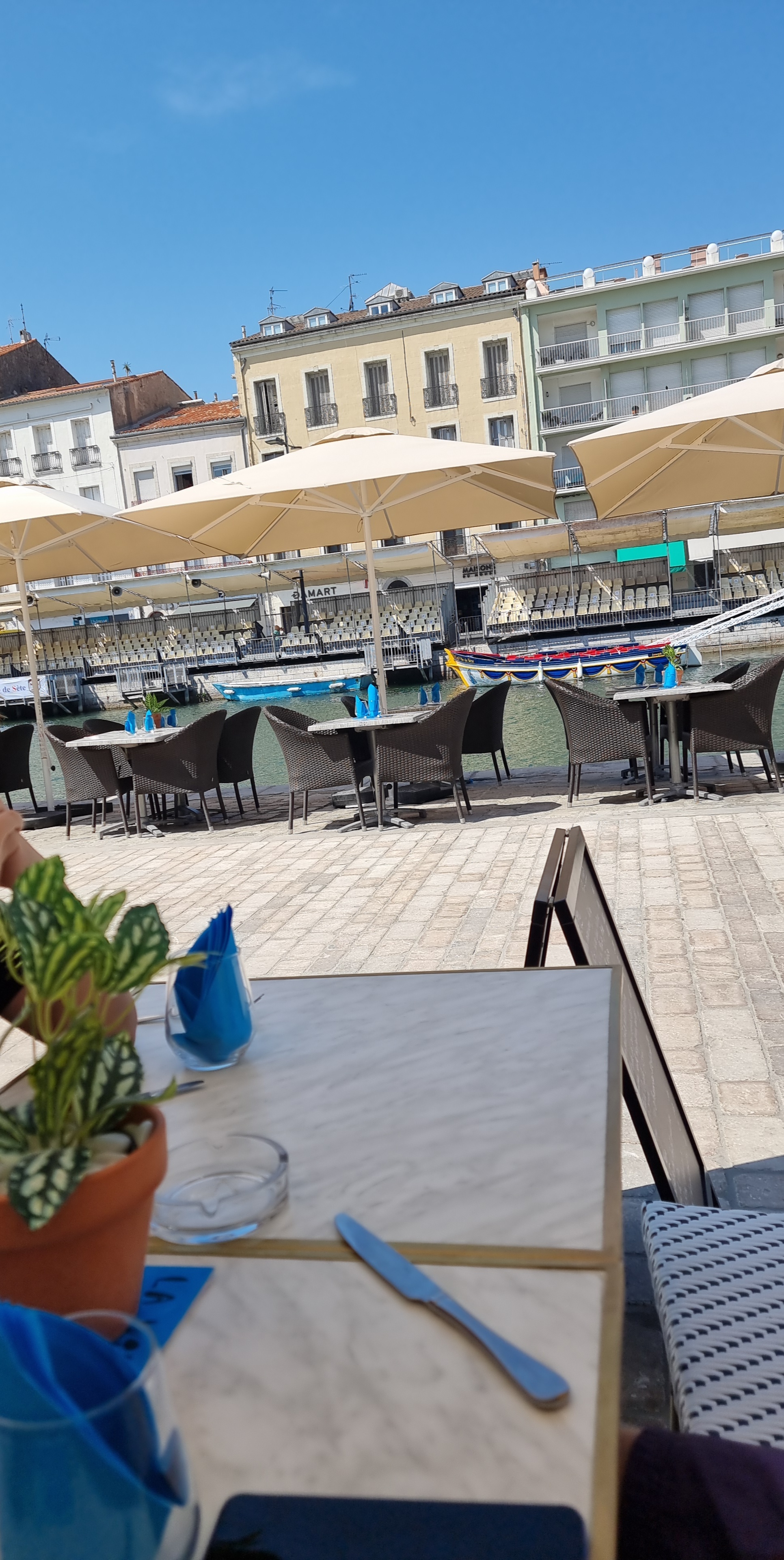 On est arrivé à Sète à l'heure du déjeuner. On c'est garé dans le parking souterrain le long du canal, il fait chaud et beau. On choisit ce restaurant, pourquoi !? C'est sympa au bord du canal, les mouettes attendent qu'on les servent. Nous ça va, service plutôt rapide et la nourriture, bof bof. Un restau pour touristes...