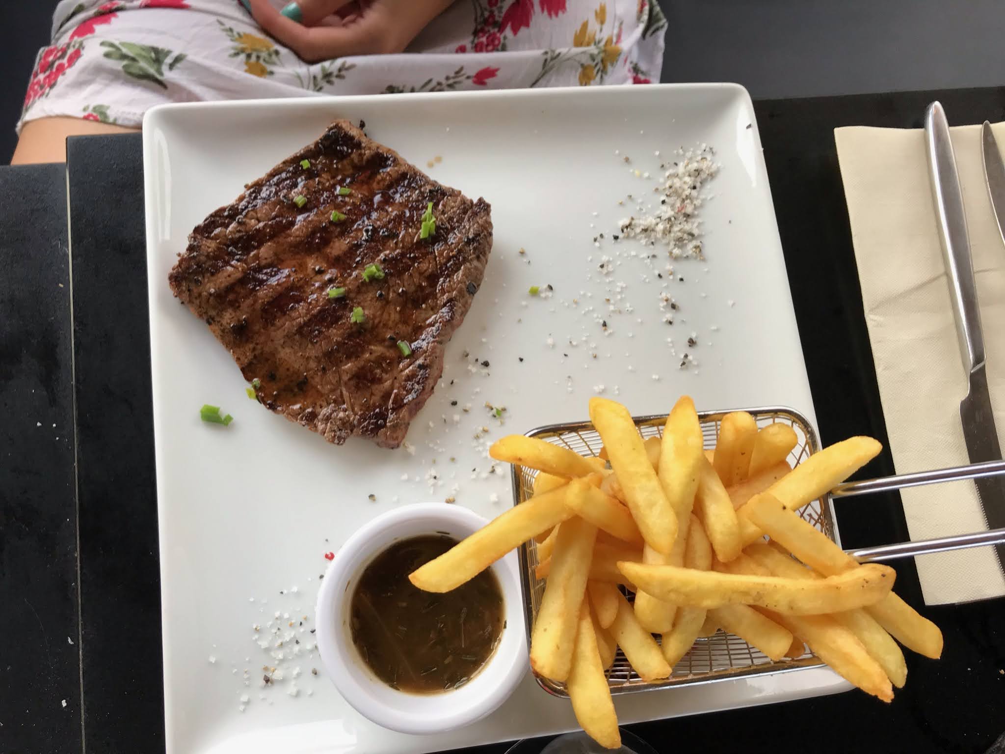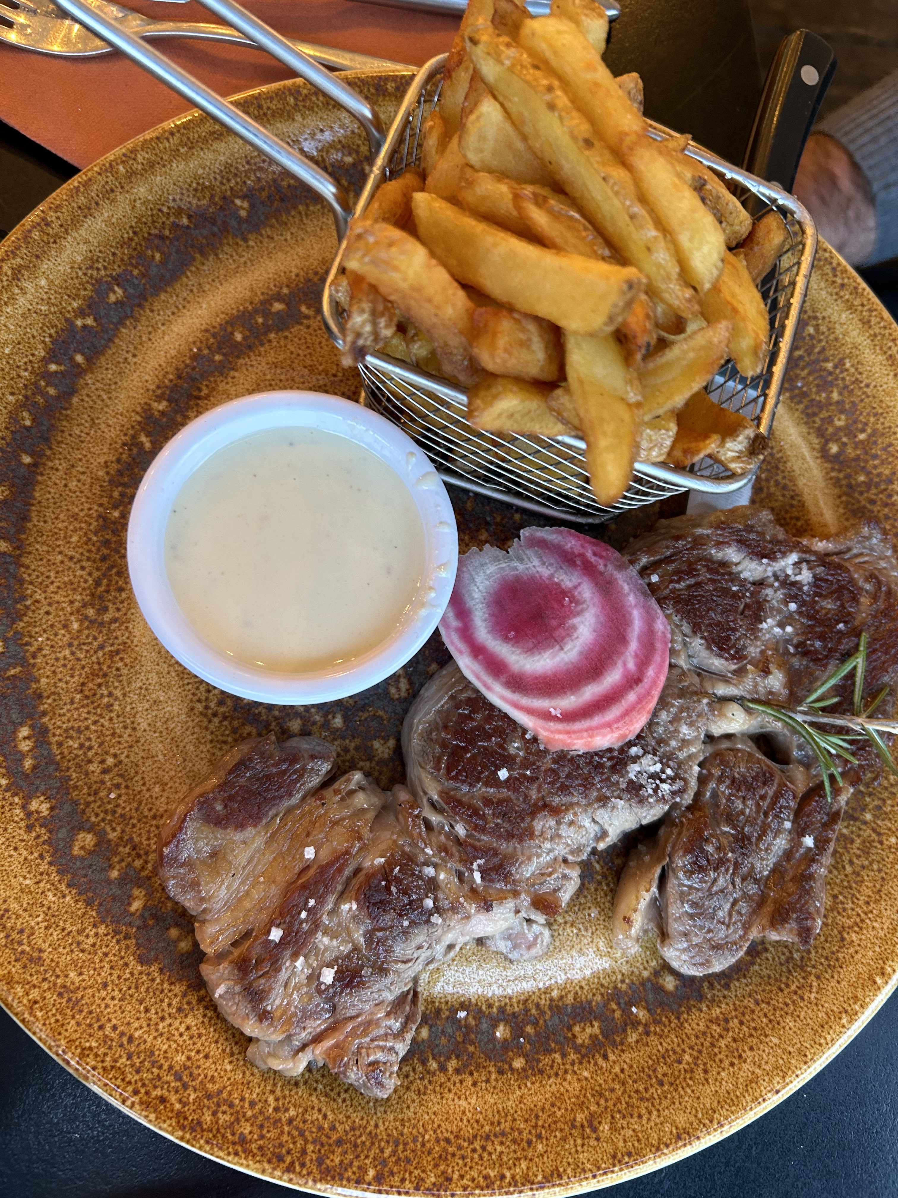 Heureusement que la serveuse était souriante.. Le service était très long, on nous a oublié 2 fois. On avait commandé une entrecôte saignante avec des légumes, elle était quasiment cuite et avec des frites.. Pas très organisés et un peu perdus dans le service malheureusement. Un peu cher pour le coup mais le décor est joli. L’hygiène des wc est à revoir..
