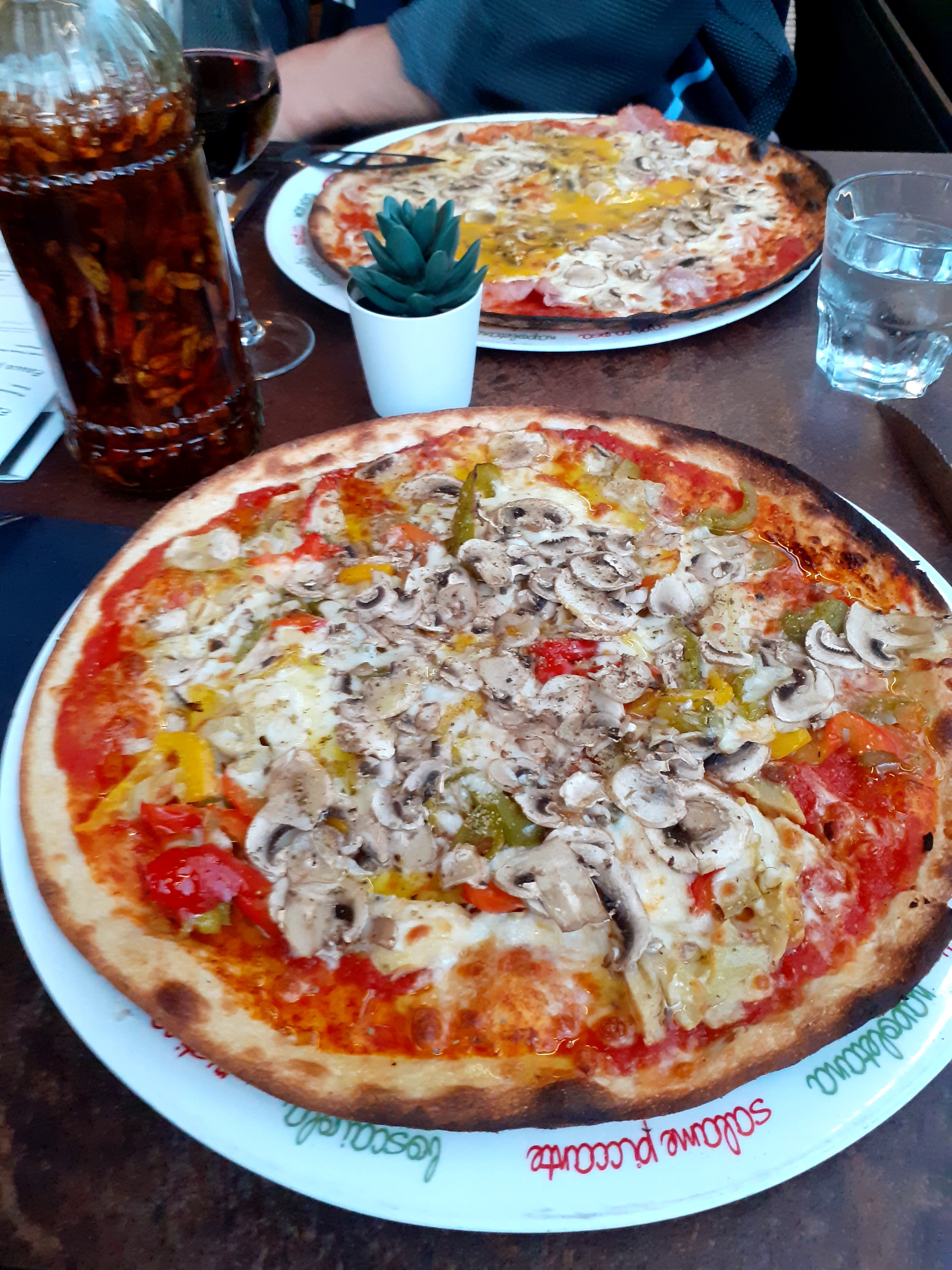 Grandes pizzas excellentes(nous avons emporté une moitié chacun, compte tenu de la taille). Personnel très agréable, souriant, disponible malgré trois salles archi-pleines.