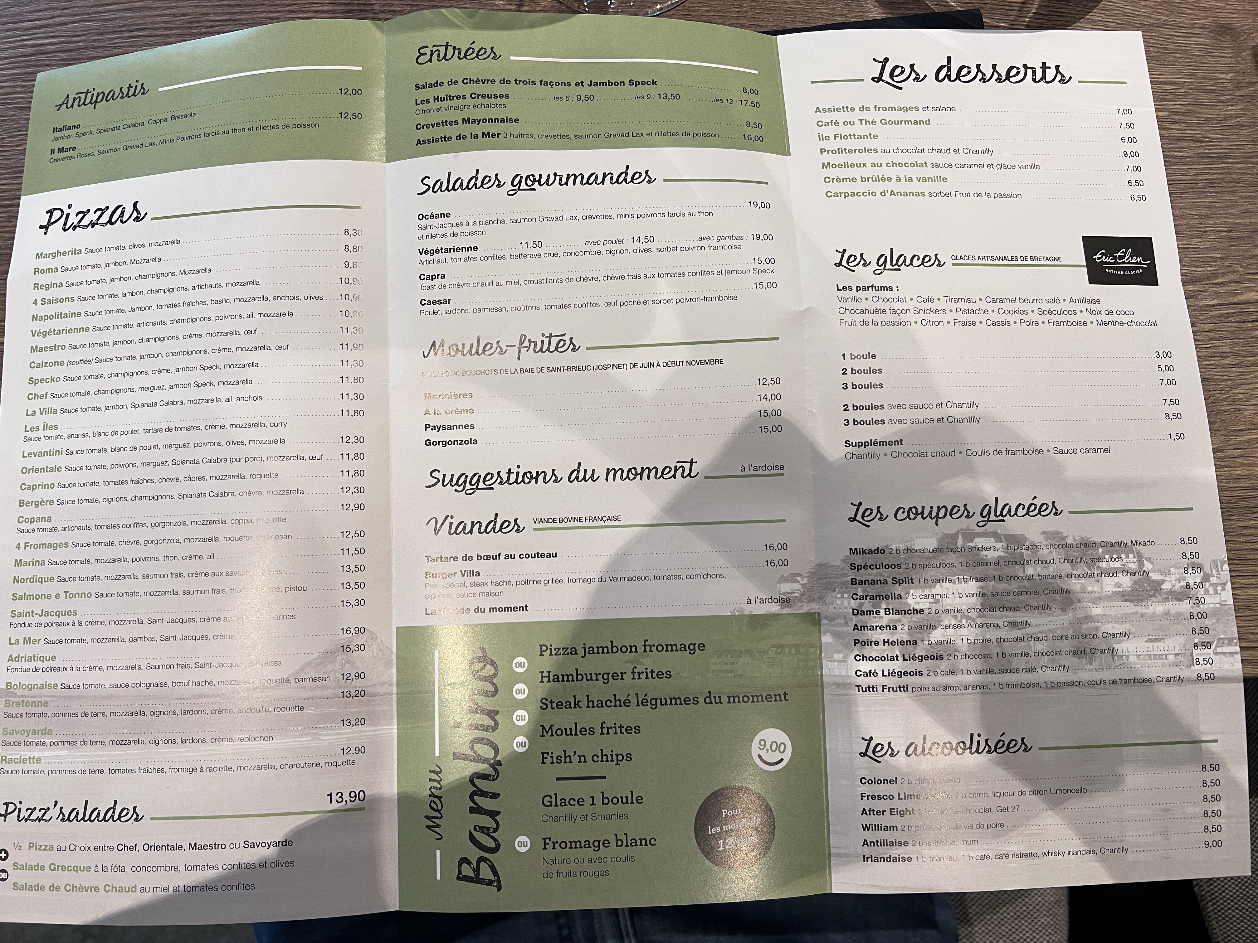 Restaurant la villa bien placé dans le centre de pleneuf. Nous avons été agréablement surpris par la surface du restaurant qui paraît petit de l'extérieur. En ce qui concerne les plats, un large choix entre pizza, moule frite, salade, viande... nous nous sommes régalé en plus prix très abordable. Je reviendrais rien que pour la suggestion du chef noix de Saint Jacques au chorizo bravo. Les serveurs sont souriants et agréables. Très bon restaurant.