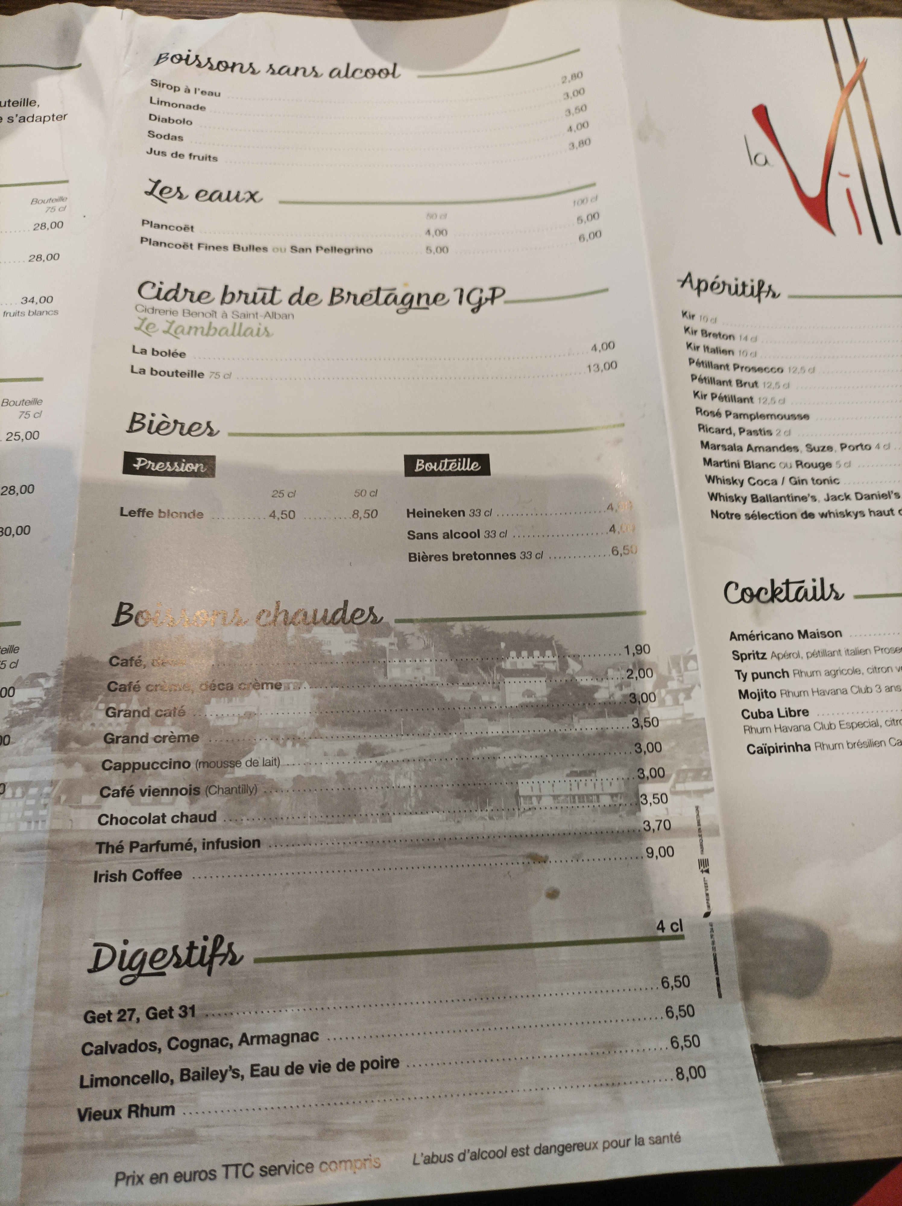 de passage on c est arrêté pour manger prix du menu 13 euro on c est dit pas chère boisson compris car de vin ou 1/2 gazeuse ou plate plat plus dessert et bien une qualité de produit du gout dans assiette et dessert basique mais hyper délicieux fromage blanc sur coulis de fruit rouge un délice a conseiller 100 %