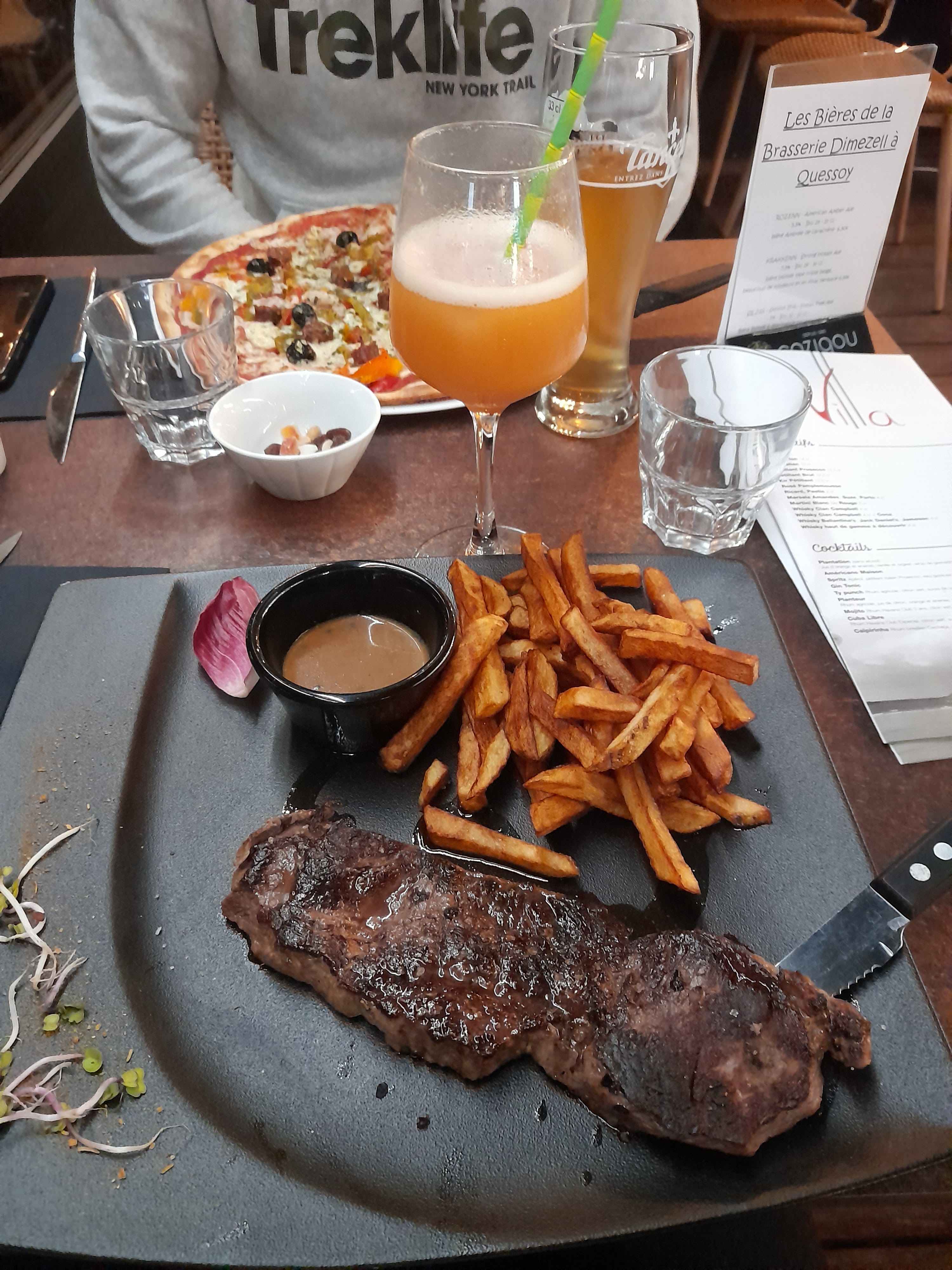 Service rapide et agréable. De l'espace entre les tables et jolie vue sur jardin et terrasse extérieure qui doit être bien sympa aux beaux jours. Dans l'assiette une pizza bien garnie à pâte (très) fine et un faux filet copieusement accompagné de légumes frais et frites. Café gourmand généreux.