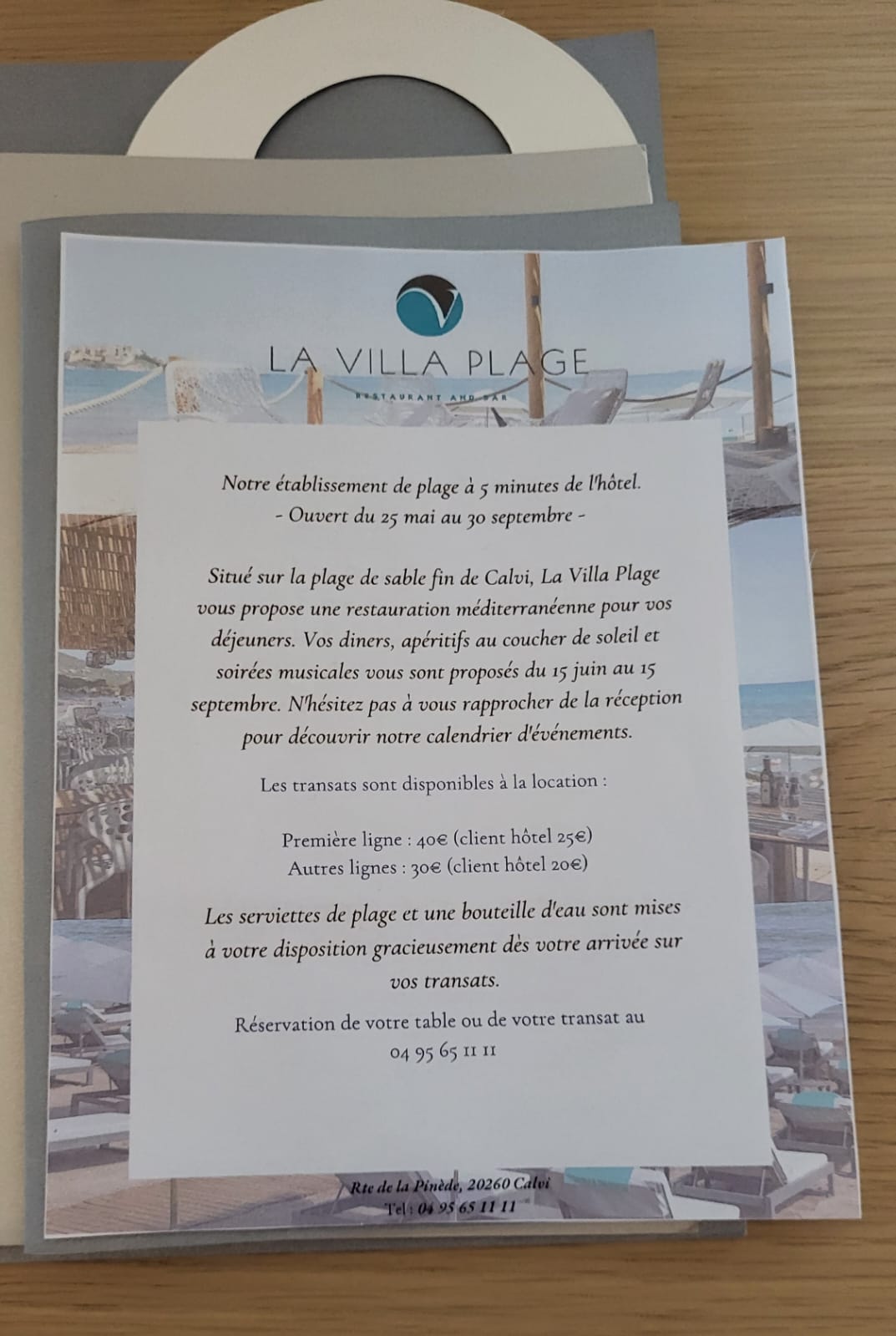 Premier séjour dans l’hôtel La Villa de Calvi. Quelques notes qui synthétisent notre séjour. Accueil voiturier : traîne le sac par terre en le sortant de la voiture.... Réceptionniste peu aimable qui peine à présenter l’hôtel. Un réceptionniste arrive et ne dit même pas « bonjour ». Faible prise en charge par la réception Je dois réserver et annuler le restaurant moi-même y compris lorsque je demande à la réception de le faire. Service au pool bar sympathique jusqu’au moment où les serveuses s’apostrophent devant nous. Nous participons ainsi à la vie interne de l’hôtel avec des commentaires de leur part sur le fonctionnement. Le room service répond au téléphone par plusieurs « Ouais » pour finir par « ça arrive ».... heureusement que je ne voulais pas des desserts ou des boissons car téléphone raccroché avant.... Service : plateau juste déposé sur la table. Pas de dressage et oubli d’ouvrir les bouteilles de sodas. La focaccia s’apparente plus a du pain de mie qu’à la spécialité qu’on connaît.... 21:00 les serviettes de bain ne sont pas changées..... les tasses mises à disposition en chambre sont enlevées mais pas remplacées. Dans la chambre, le dressing est mal placé. Il faut choisir entre ouvrir la porte de celui-ci ou celle qui va dans la chambre. Pas de spot devant le dressing. On y voit donc très mal pour choisir les habits. Chambres à la décoration froide et sans personnalité loin des standards d’un 5 étoiles. Cela ressemble à ce qui se fait dans les grandes chaînes hôtelières. Les bâtiments de l’hôtel ressemblent plus à un club de vacances qu’à un hôtel de ce standing. Pas de service dans la seconde piscine. Impossible d’avoir un café par exemple. A la piscine principale un tas de serviettes utilisées la veille est toujours là 10h00 et aucune serviette propre n’est disponible. Petit déjeuner sans mesure d’hygiène : Seul le masque est obligatoire mais pas pour tous les clients ni tout le personnel. Pourtant tous les aliments sont à l’air libre sans protection. Certains détails sont « choquants » beurre coupé directement dans la tablette de beurre par exemple. Le buffet est assez sommaire et les serveurs très familiers.