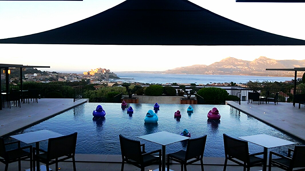 C'est un bel hôtel au calme, avec une vue magnifique sur Calvi. Personnel très sympathique et serviable avec de grandes chambres bien aménagées. Le terrain et la piscine sont bien présentés et se trouvent à quelques pas du centre de Calvi, même si le chemin du retour est en montée. Mais ils pourraient perdre les canards en caoutchouc dans la piscine devant le restaurant ! (Certains designers intelligents ont l'idée d'être drôle)