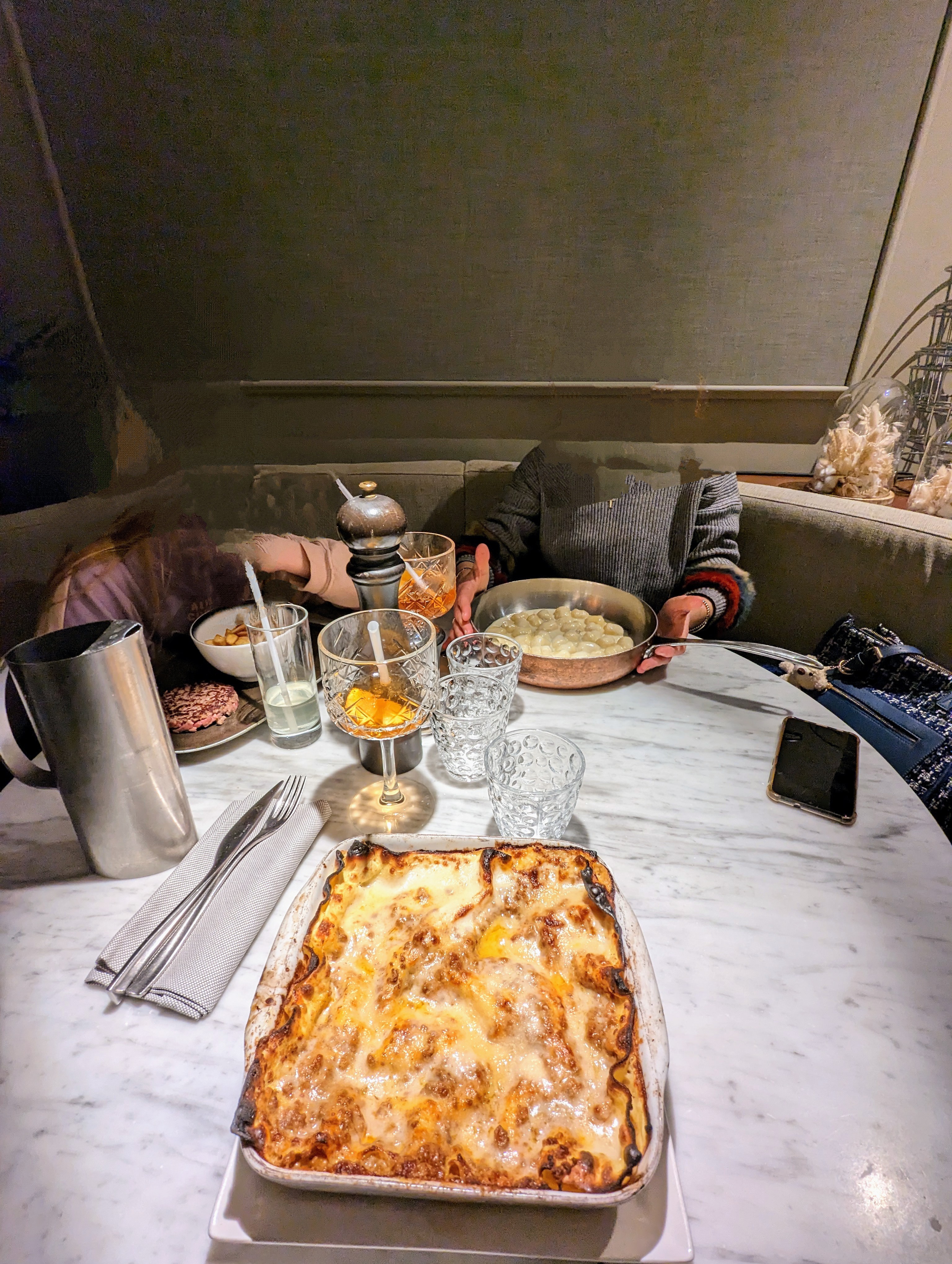 Très bel accueil dans un restaurant magnifiquement décoré Les serveurs sont professionnels et à l'écoute La cuisine est généreuse peut être un peu trop Les lasagnes sont délicieuses Par contre les maccheroni de la mama sont préparés à l'avance et réchauffés gratinés au moment du service Les boulettes sont ridiculement petites et froides Quel dommage Franchement pour cela j'hésite à recommander ce restaurant Peut-être une mauvaise expérience accidentelle !? A réessayer
