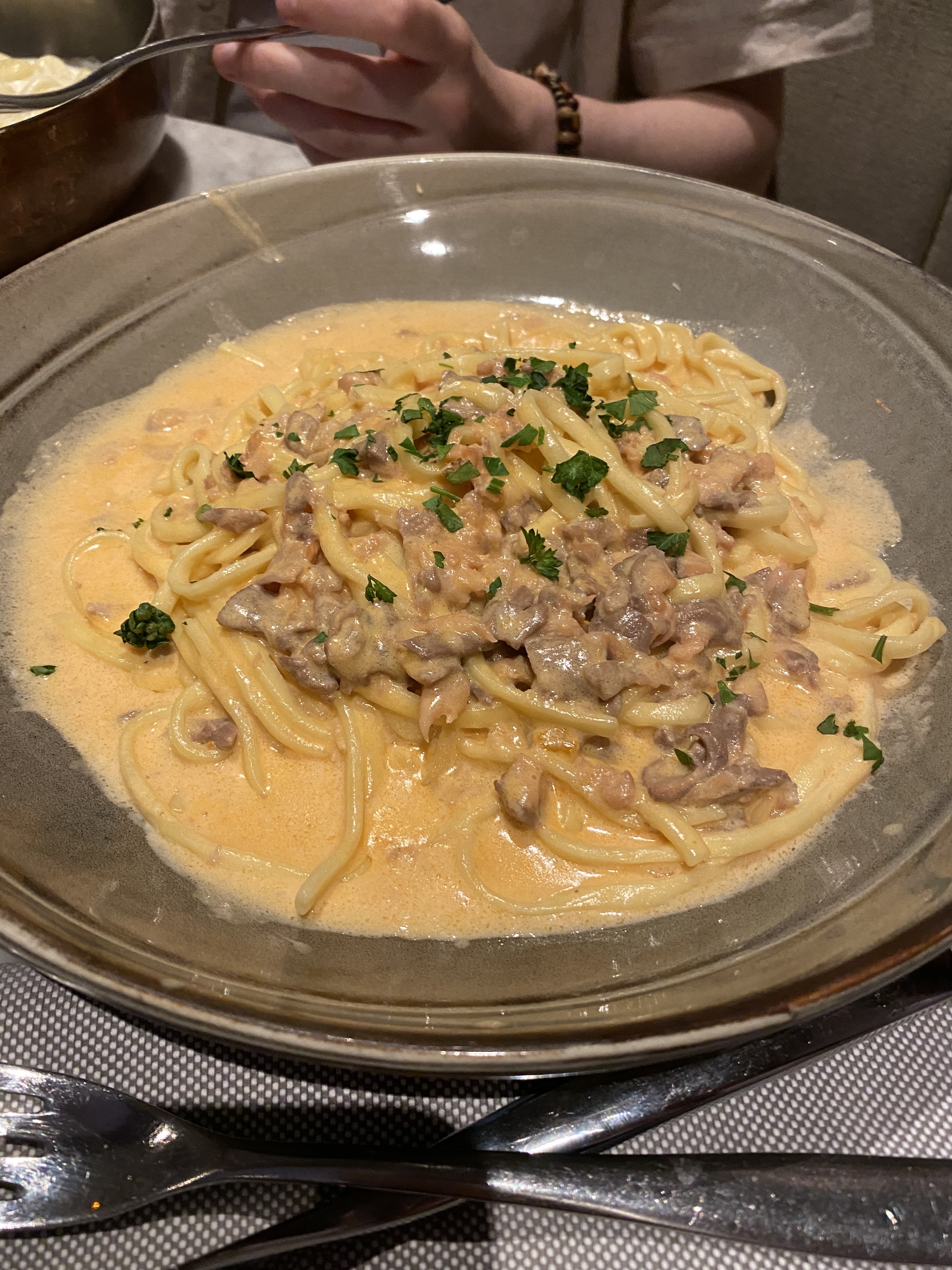 Nous avons pris chacune un plat de pâtes, c'était vraiment excellent !! mais trop copieux... nous n'avons donc pas pu prendre de dessert et sommes sorties du restaurant un peu ballonnées, dommage ! Mais les gros mangeurs seront ravis au moins (les desserts avaient l'air délicieux) ! Le service était réussi mais il y a énormément de monde (pensez à réserver) ce qui rend l'endroit un peu étouffant et bruyant.
