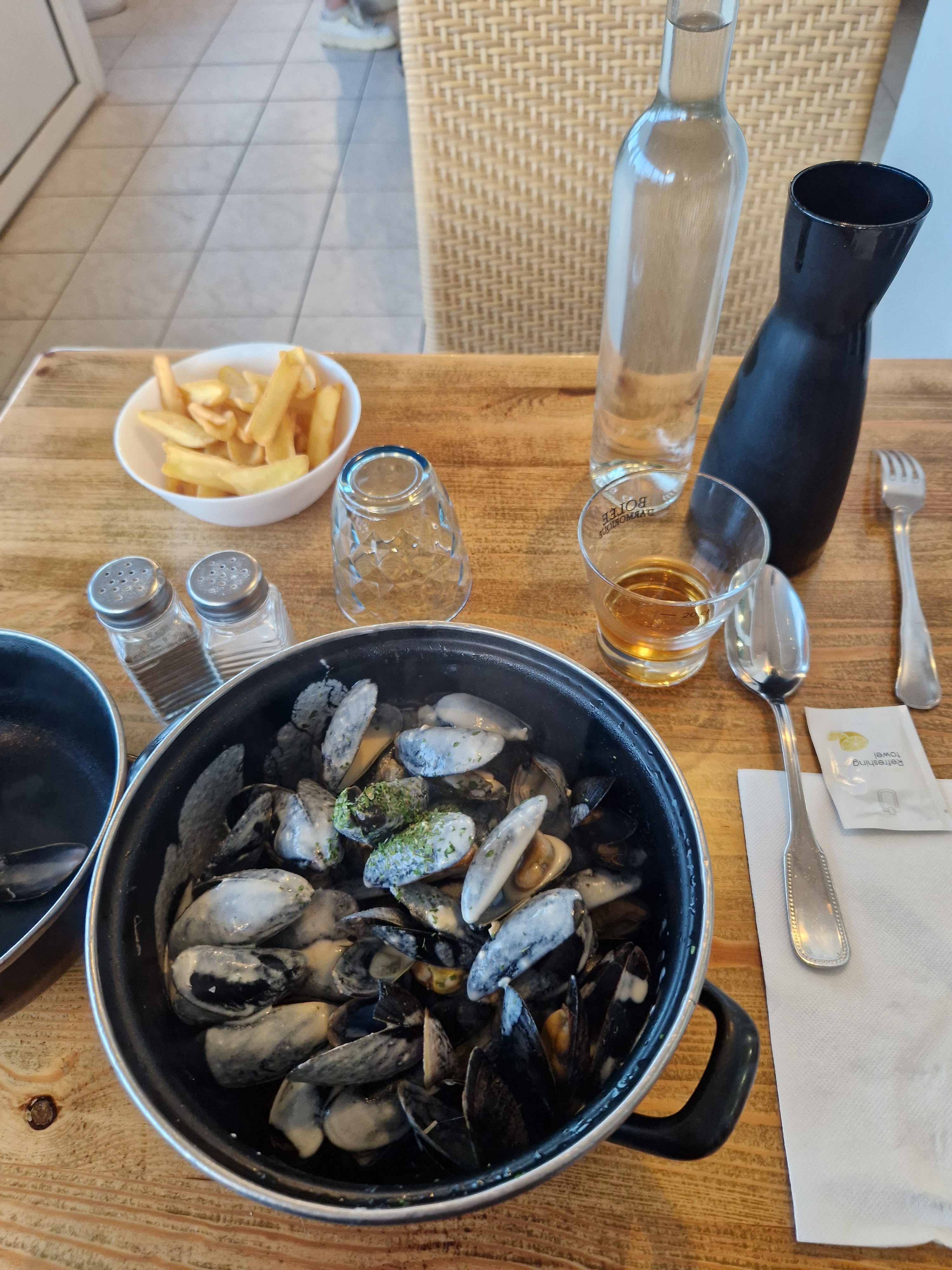 Bien reçu par le jeune serveur.. Nous avons mangé des moules à la crème avec frites.. Les coquillages étaient délicieux mais petits. Nous attendons tjr nos desserts personnalisés de boude ainsi que les patrons... Dommage..