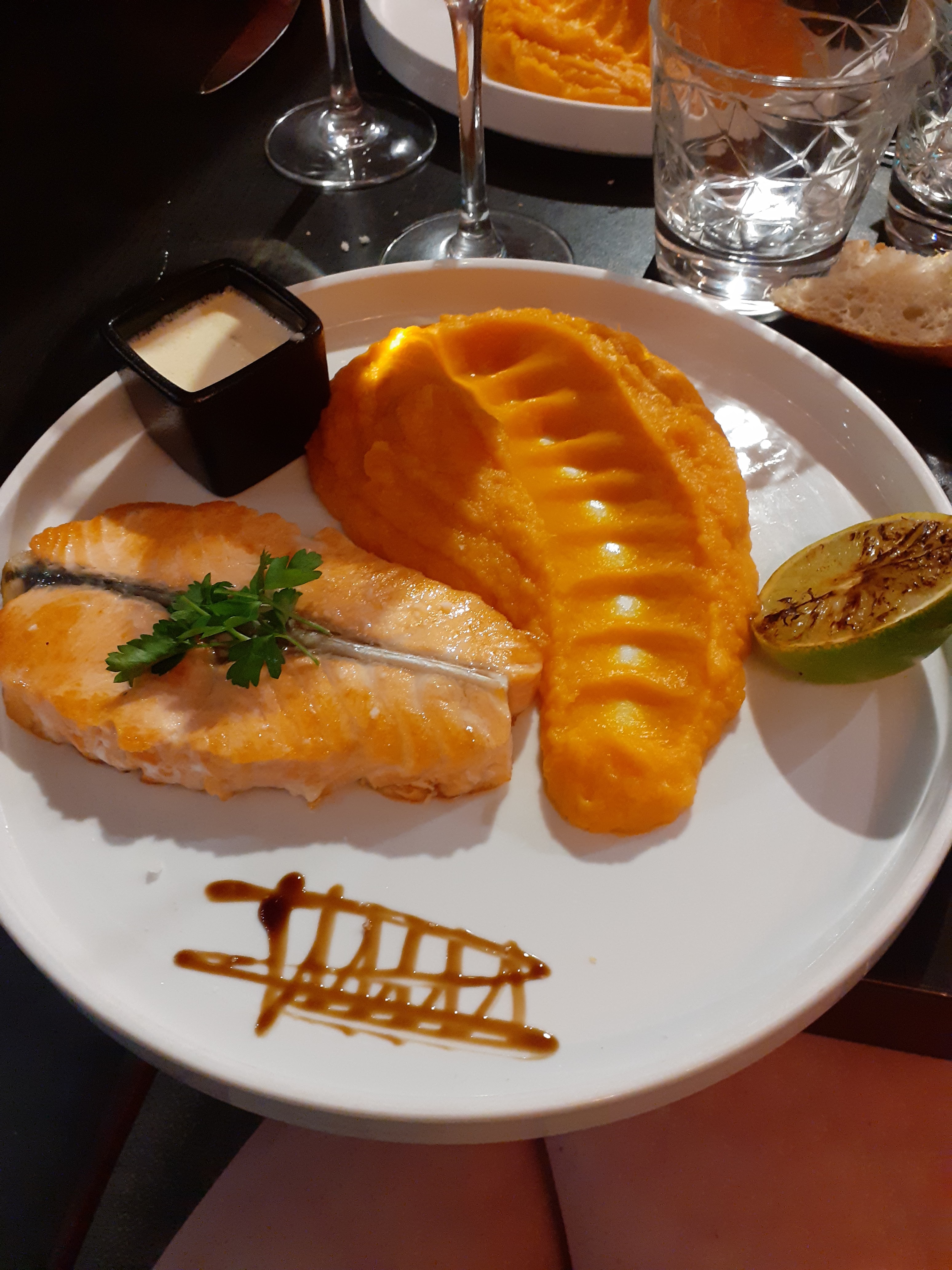 Resto découvert par hasard en se baladant dans le quartier Les serveurs sont tres gentils et très réactifs. La cuisine est de bonne qualité. J'ai adoré le poelon de moules à la sauce escargot! J'ai été agréablement surprise La sauce passion qui accompagne le saumon mariné était bonne La sauce citron qui accompagnait le dos de saumon était très bonne! La peau du saumon n'était pas hyper bien écaillée, ça arrive mais ce n'est pas toujours agréable. La musique de fond est très sympathique, bonne playlist La déco est bien Le resto est un peu petit ou une des clientes d'une table parlait vraiment fort. Je recommande sans soucis! Le café gourmand est grand. J'aurais fait le choix d'autres mignardises pour l'accompagner mais ça allait quand même !