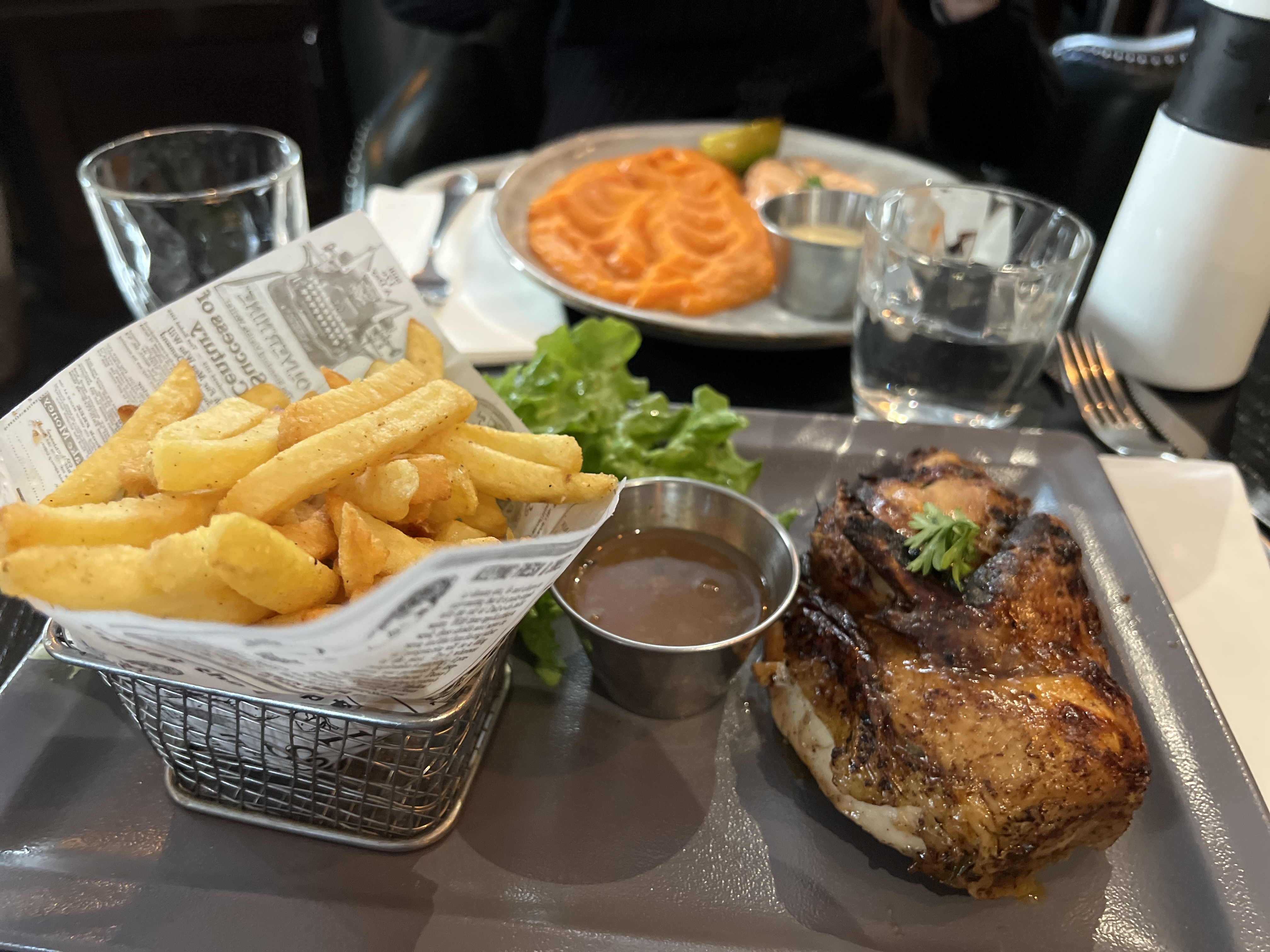 Cuisine délicieuse, simple mais excellente. Ils s'attendent en quelque sorte à ce que vous commandiez du vin ou un cocktail, mais c'est Paris et cela semble arriver souvent. J'ai eu le demi-poulet et la crème brûlée et ils étaient tous les deux excellents. Possibilité de s'attarder autour de votre dessert et de votre café, ou de boire des cocktails à l'extérieur. Une expérience formidable!