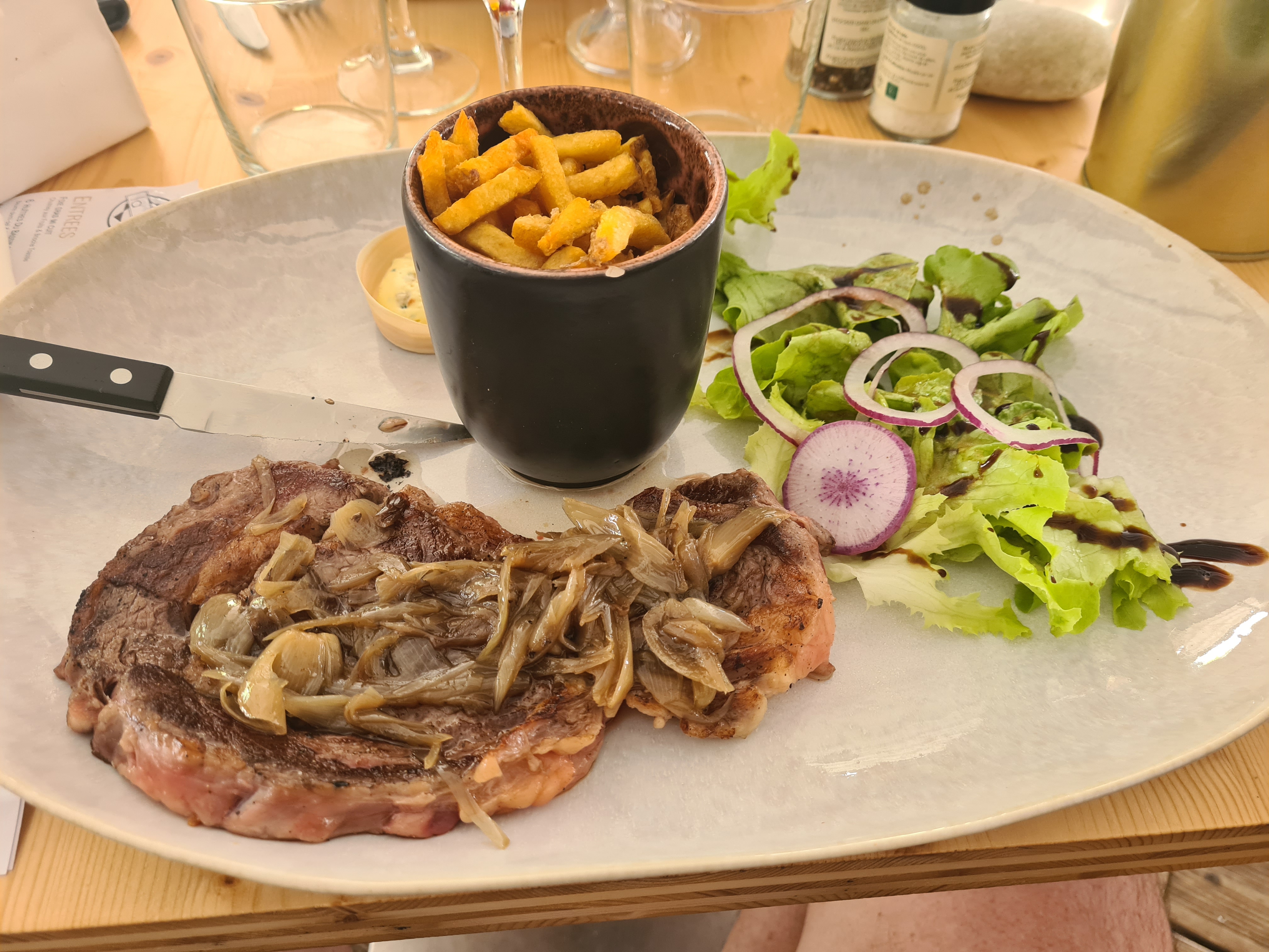 Serveuse pas souriante. Frites qui ne ressemblent pas à des frites à manger avec une cuillère à soupe!! Beaucoup de nerfs dans l'entrecôte. Table de 15 personnes et uniquement des hommes très très bruyants. Pas au top pour une soirée qui se voulait reposante..