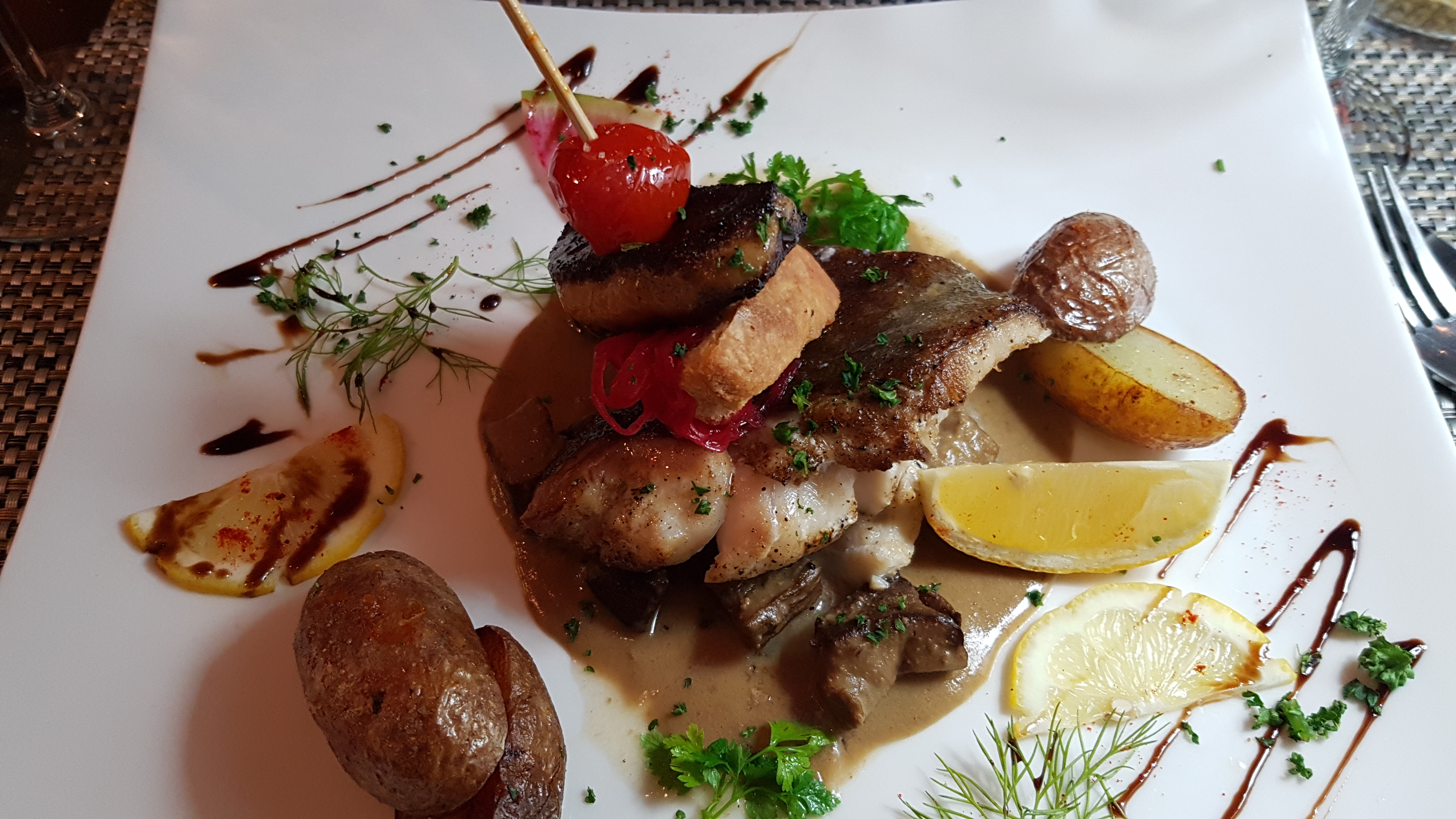 Très bon accueil , serveuses et serveur souriant et sympathique . Pour avoir pris un quasi avec sa sauce et ses légumes , j'ai vraiment adoré le quasi la cuisson superbe par contre les légumes ??? J'ai eu l'impression d'avoir plus une déco qu'un plat avec ses légumes ... Une pomme de terre un morceau de brocolis qui contient dans une cuillère à café , une allumette de carotte et courgette.J'ai vraiment trouvé très limite car je suis reparti le ventre vide