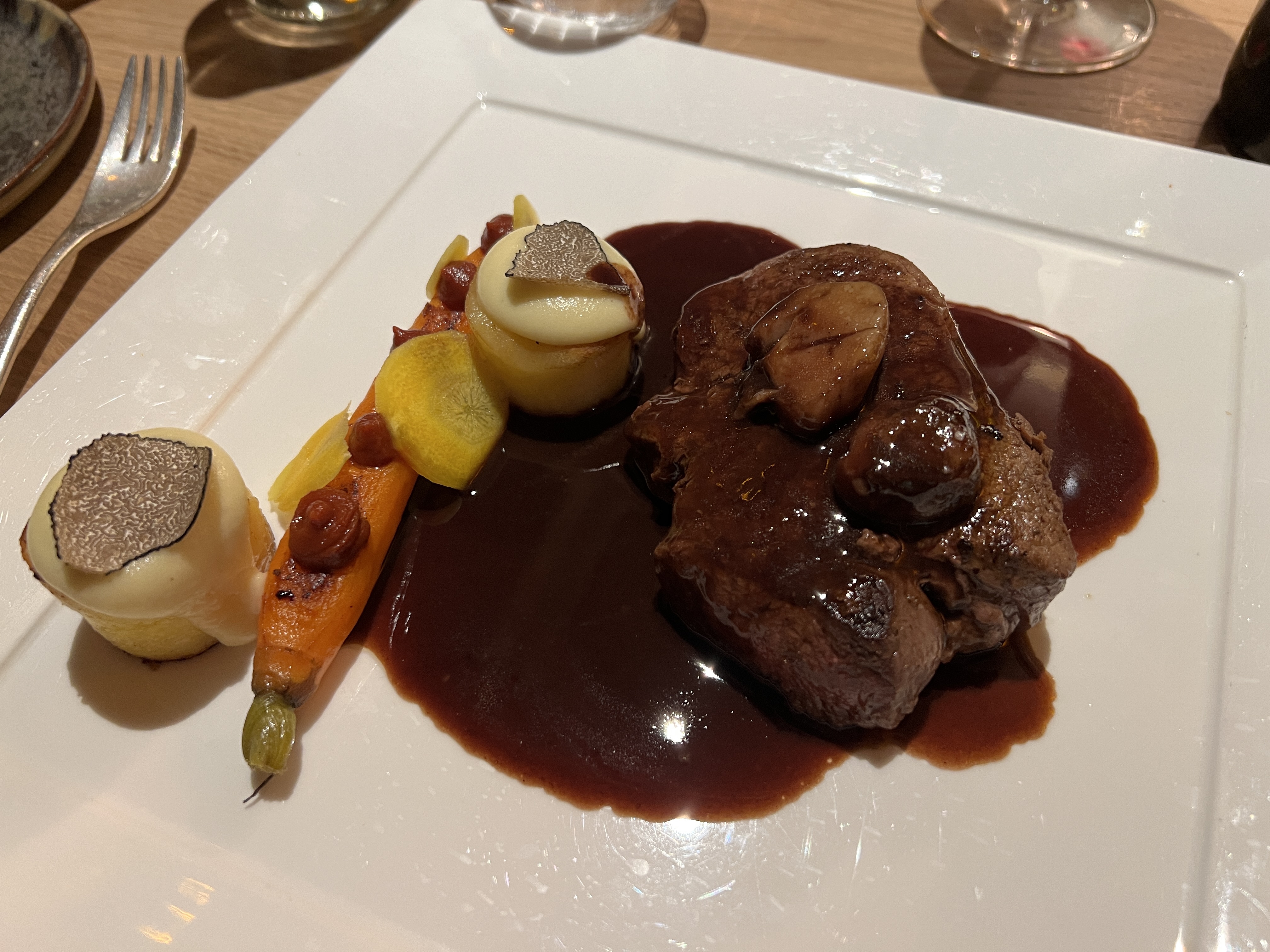 Ambiance feutrée, décor luxueux, service parfait, un plaisir pour les sens. Le plat mériterait un accompagnement plus copieux cependant. Les ris de veau avec seuls des oignons en accompagnement vont vous laisser sur votre faim à moins de prendre une entrée. Un Medoc au verre très bien choisi, mais le café du capuccino aurait gagné à ne pas couler sur la tasse. Enfin un moelleux maison cuit minute de belles proportions à permis de remplir un peu l'estomac. 😉 Un beau moment en tout cas. 😊