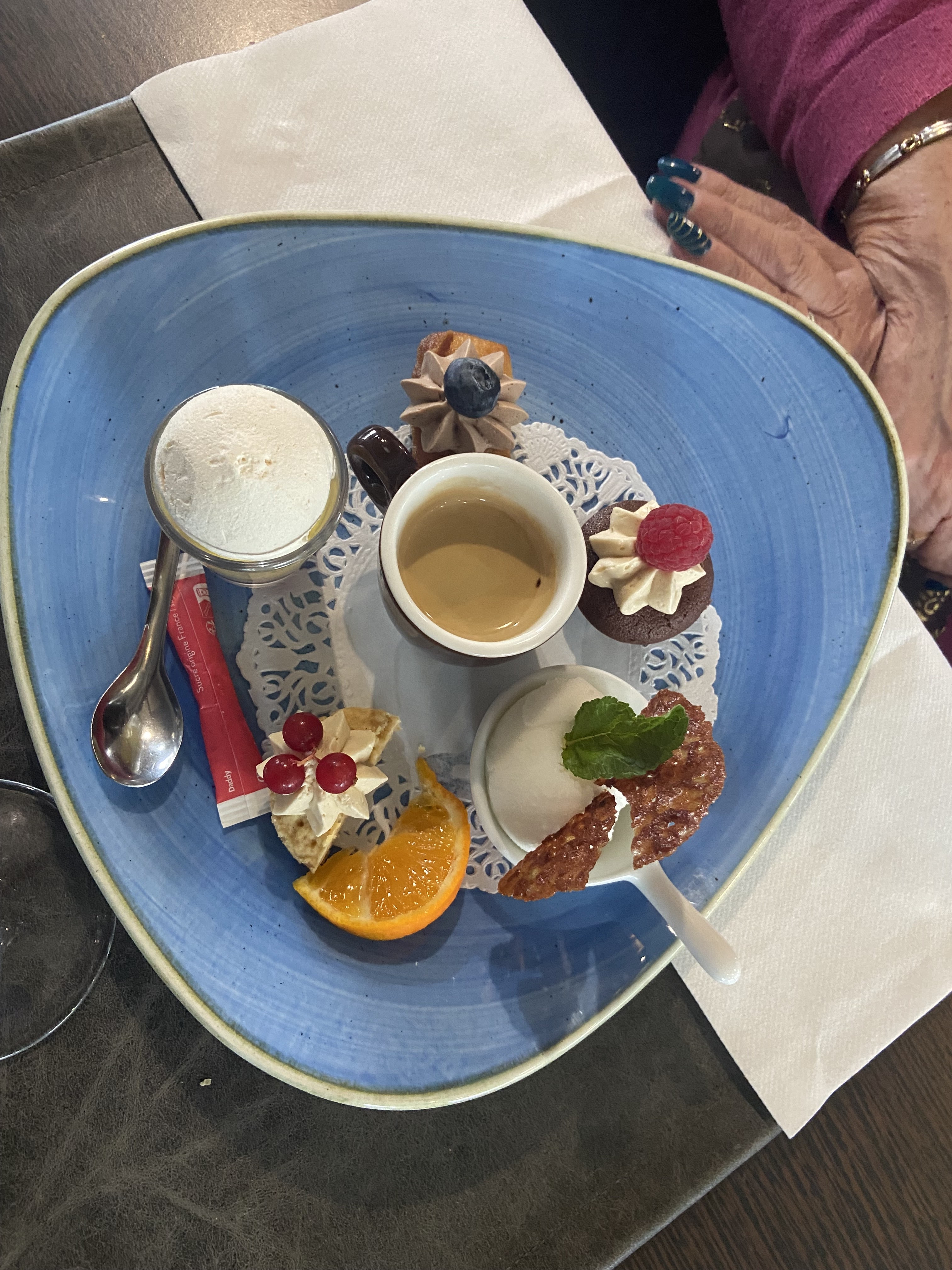Repas du samedi à la carte. Très bon magret de canard assiette bien fournie et café gourmand sympz
