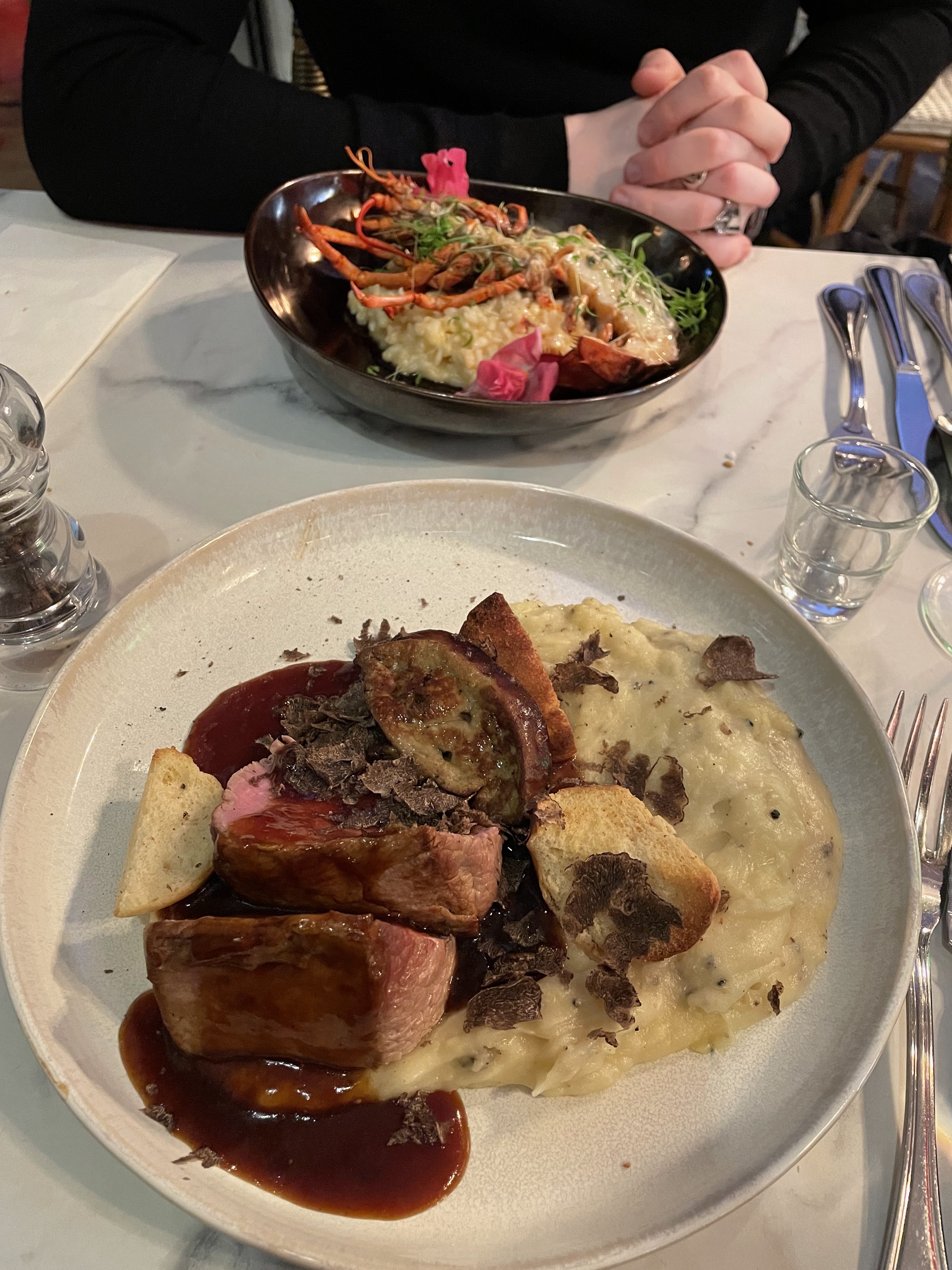 Magnifique restaurant. Nous avons été très bien accueillis. L’ambiance est parfaite, les serveuses très gentilles, l’endroit est très beau. Les plats étaient juste succulents. Nous avons pris le filet de bœuf avec purée de truffe et un risotto et homard … tout était excellents. C’était à la hauteur de nos attentes ! Merci encore !
