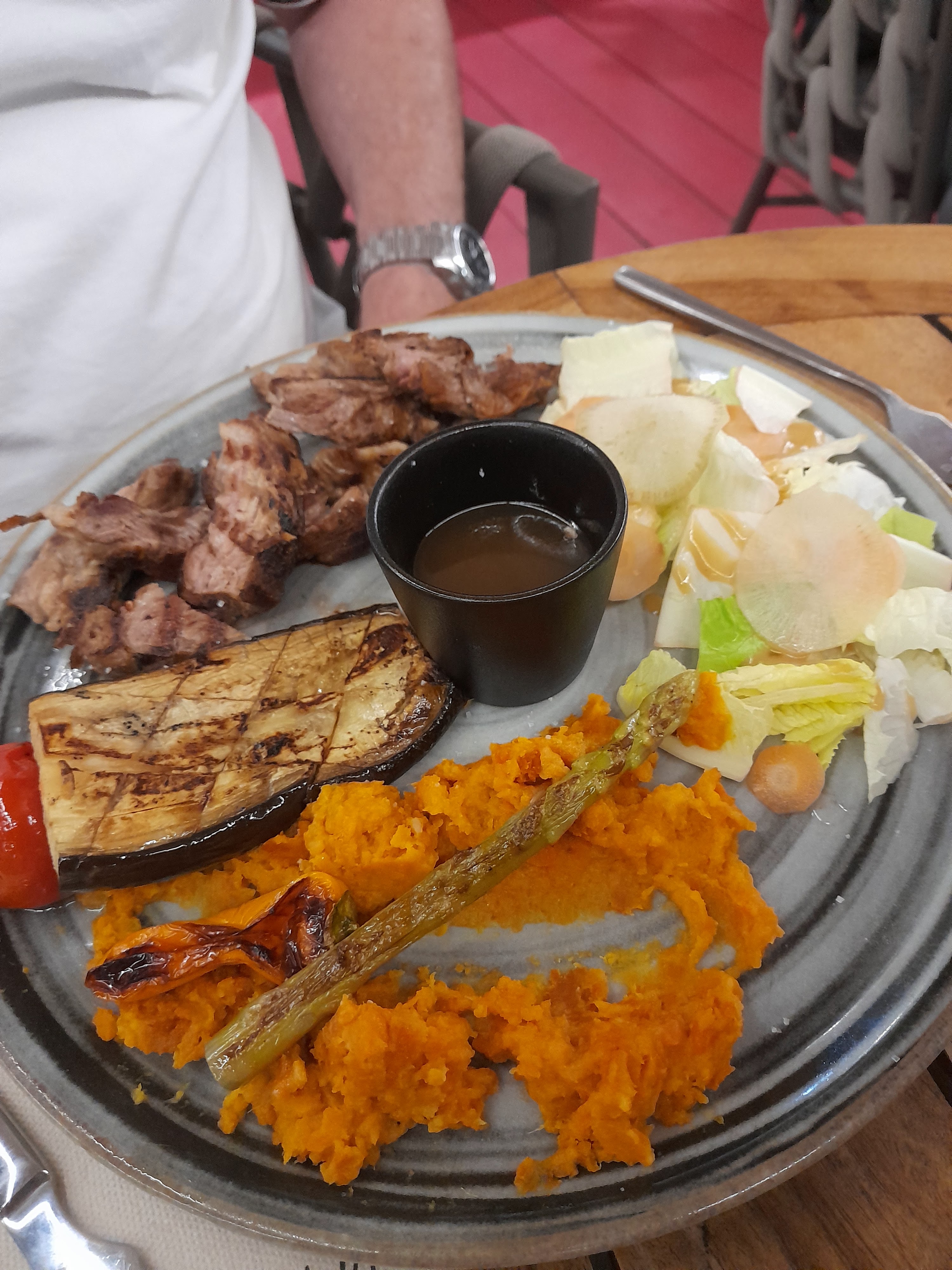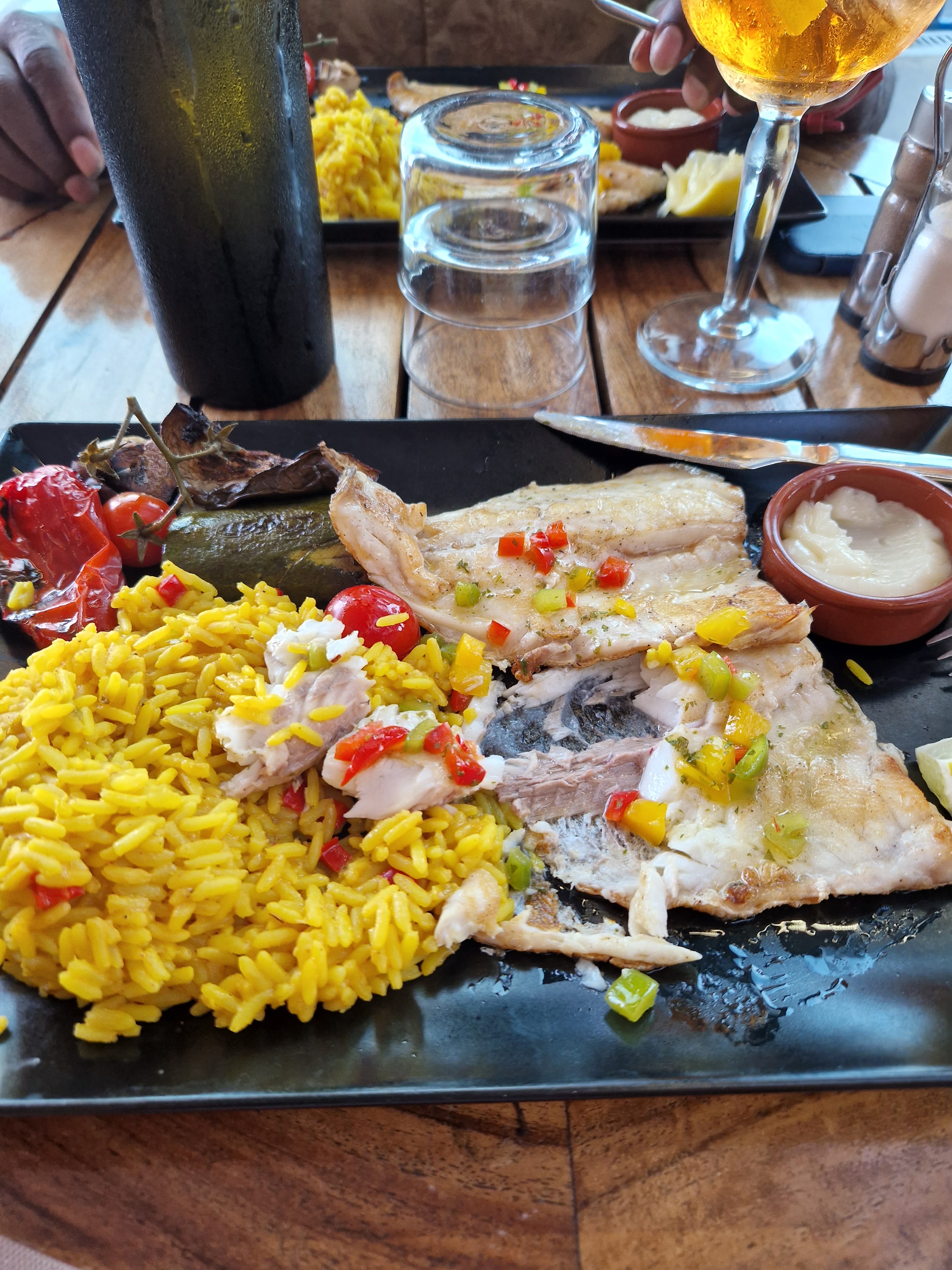 Service assez lent, pâte carbonara très bonne mais beaucoup trop de crème cela baigné dedans ce qui devenait écœurant à la longue, sans oignons . Riz très sec et fade également mais le poisson et les légumes grillés été top.