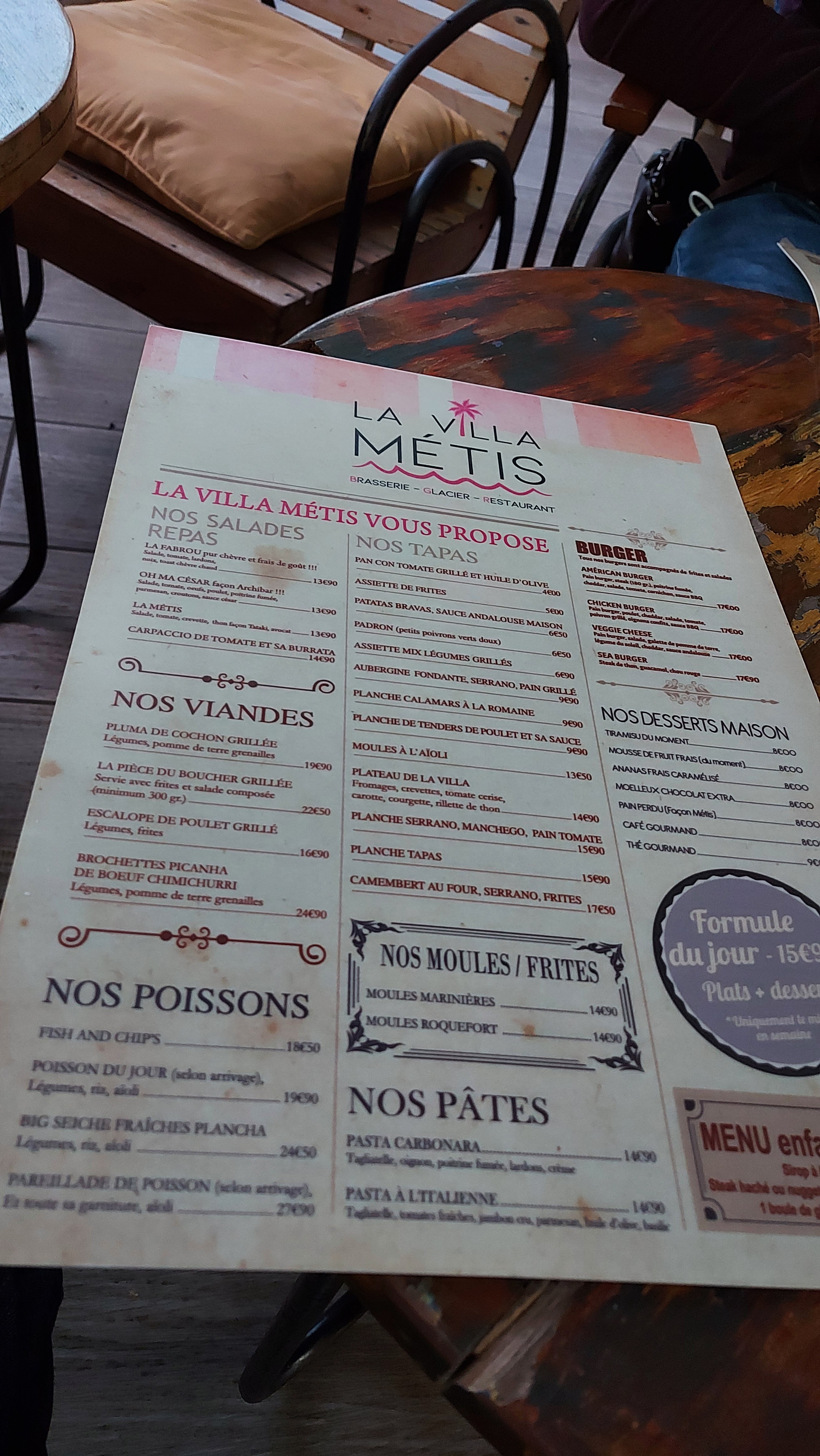 Oui, je sais, je suis toujours un peu méfiant lorsqu'il s'agit de dîner en bord de mer (prix, service, propreté etc.) Mais je me suis laissé tenter par la Villa Metis que l'excellent glacier d'à côté (désolé pour la coupure pub, mais ses glaces sont vraiment extra) nous a chaudement recommandé. Et nous avons été ravis ma femme et moi. Service avec le sourire, prévenant, agréable, rapide, bien présenté, bon et vraiment pas trop cher pour un bord de plage. Vraiment c'était une excellente surprise et on s'est régalés : ça valait vraiment le coup de s'y poser. Conseil pour le patron : ils sont vraiment sympa les jeunes du service et donnent vraiment une très bonne image de la Villa (dimanche 12 soir) : augmentez les plein ! 😄
