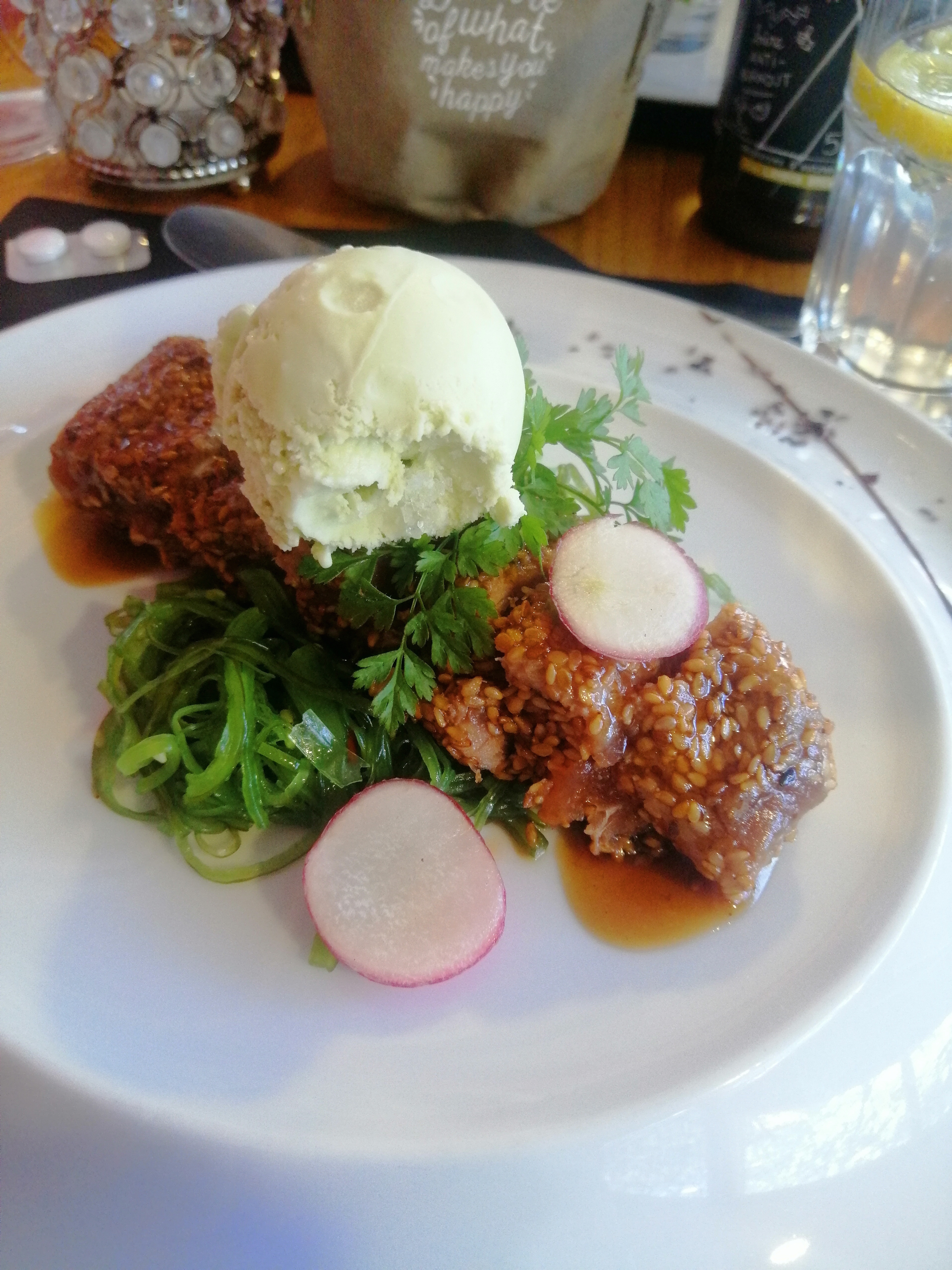 Assez déçu 😢 Le tataki était complètement cuit et très salé; le poulpe servi sur une purée. Le poulpe était qd même bon. Pas de distanciation à l’extérieur; nous avons dîné entre 2 sapinettes (au contact) et des voisins éloignés au mieux de 40cm... Pas très concluant !