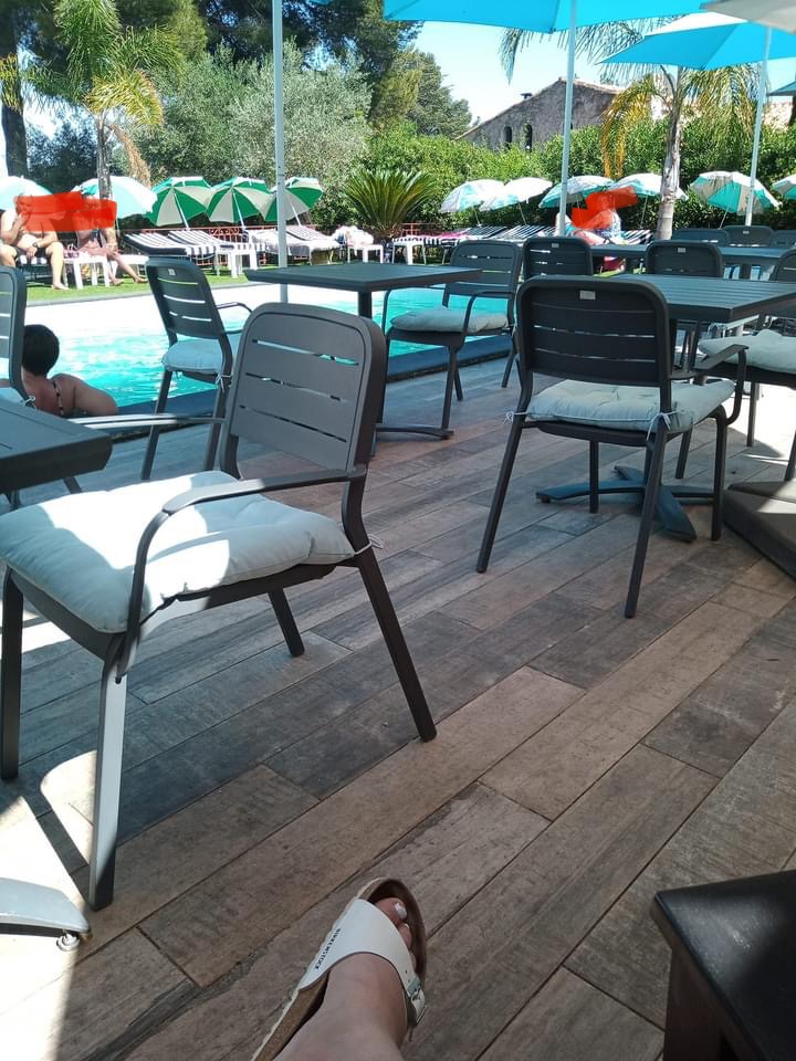 Une serveuse adorable et serviable souriante et gentille enfin bref superbe, un patron sympathique et agréable, un repas rassasiant et gourmand. Pour ma part mi cuit de thon excellent, légumes savoureux, pour mon amie, entrecôte cuisson parfaite et frite maison très bonne, piscine propre, serviette à dispo, enfin bref une première expérience vraiment géniale !!!!! Je recommande pour les couples ou entre amis, famille nombreuses a éviter car piscine trop exiguë pour des enfants et ça n’est pas le concept. Merci à toute l’équipe !