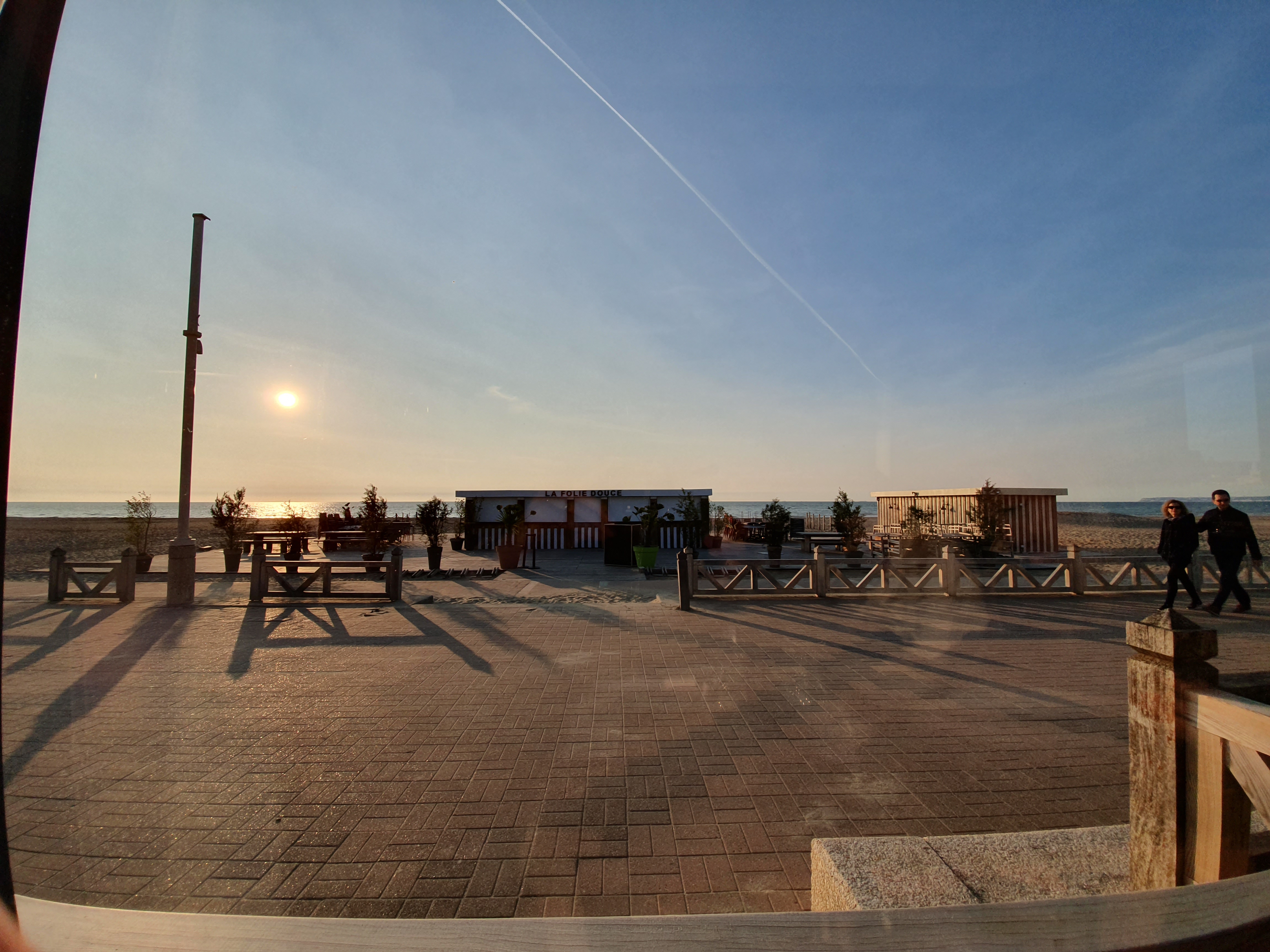 Pause cet après-midi pour boire un verre face à la plage. Assez peu confortable mis à part les parasols ombrageant la terrasse.