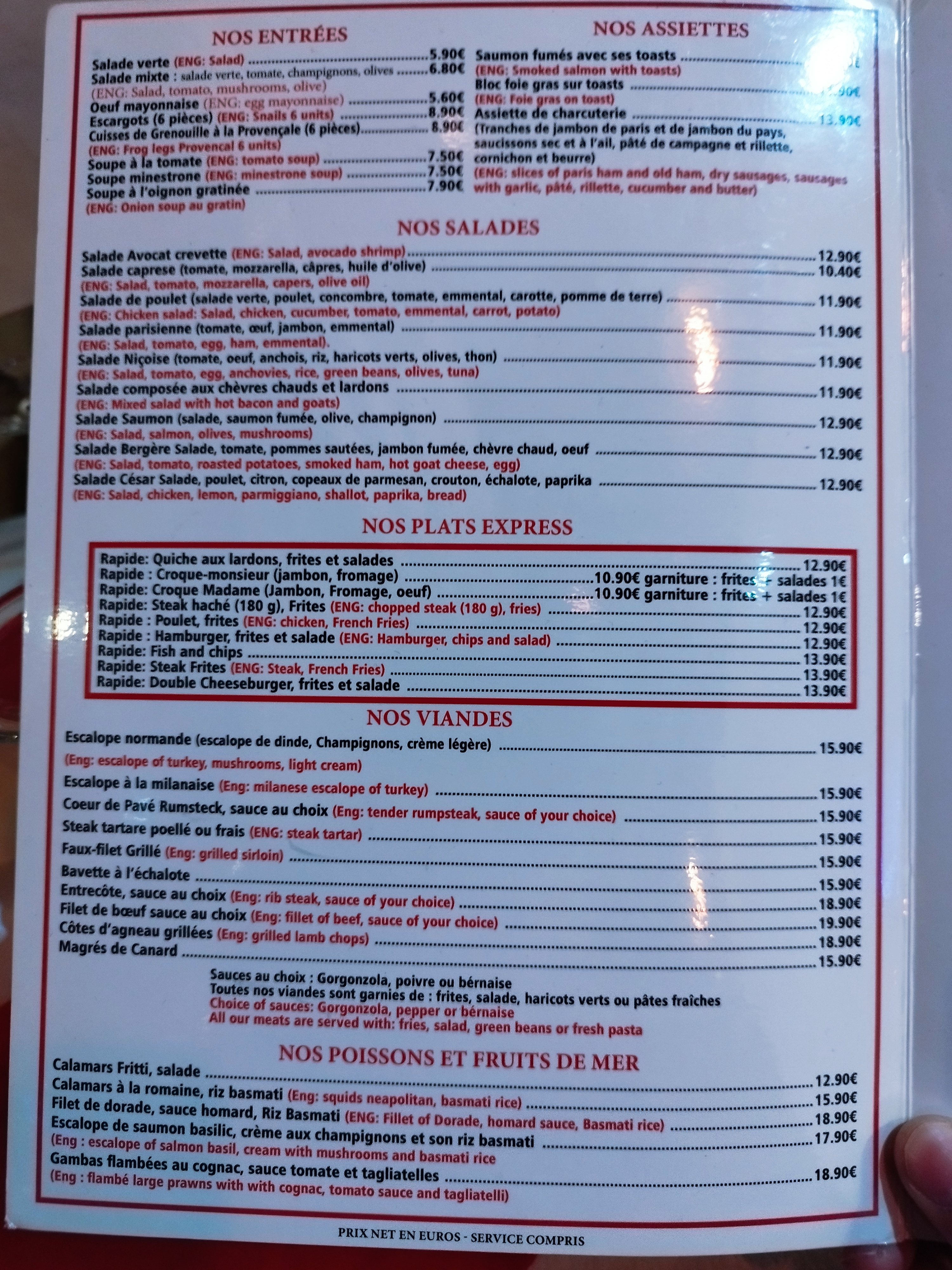 Bon rapport qualité prix gai et incroyable. J'ai mangé une salade de filet de hareng, un steak 8oz avec frites et salade et un plateau de fromages pour moins de 15 euros. Le serveur est également très professionnel et plein de caractère. Chaque fois que je serai à Paris, je reviendrai très certainement. Hautement recommandé!