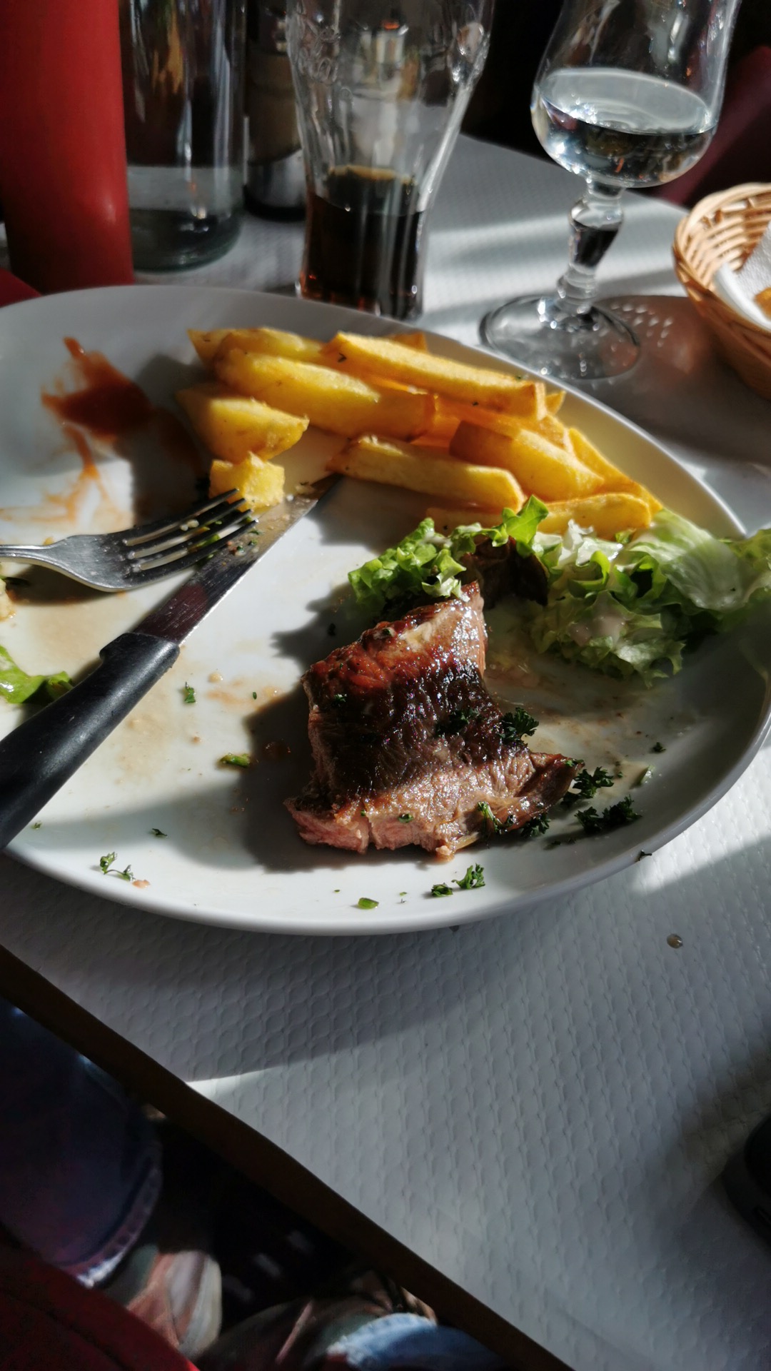 L'assiette d'entrecôte avec le vin de Bordeaux était bonne, prix moyens. . .