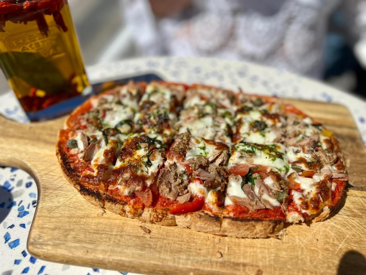 Arrêt parfait pour une collation et quelque chose à boire. La bruschetta ressemble plus à une pizza donc parfaite à partager.
