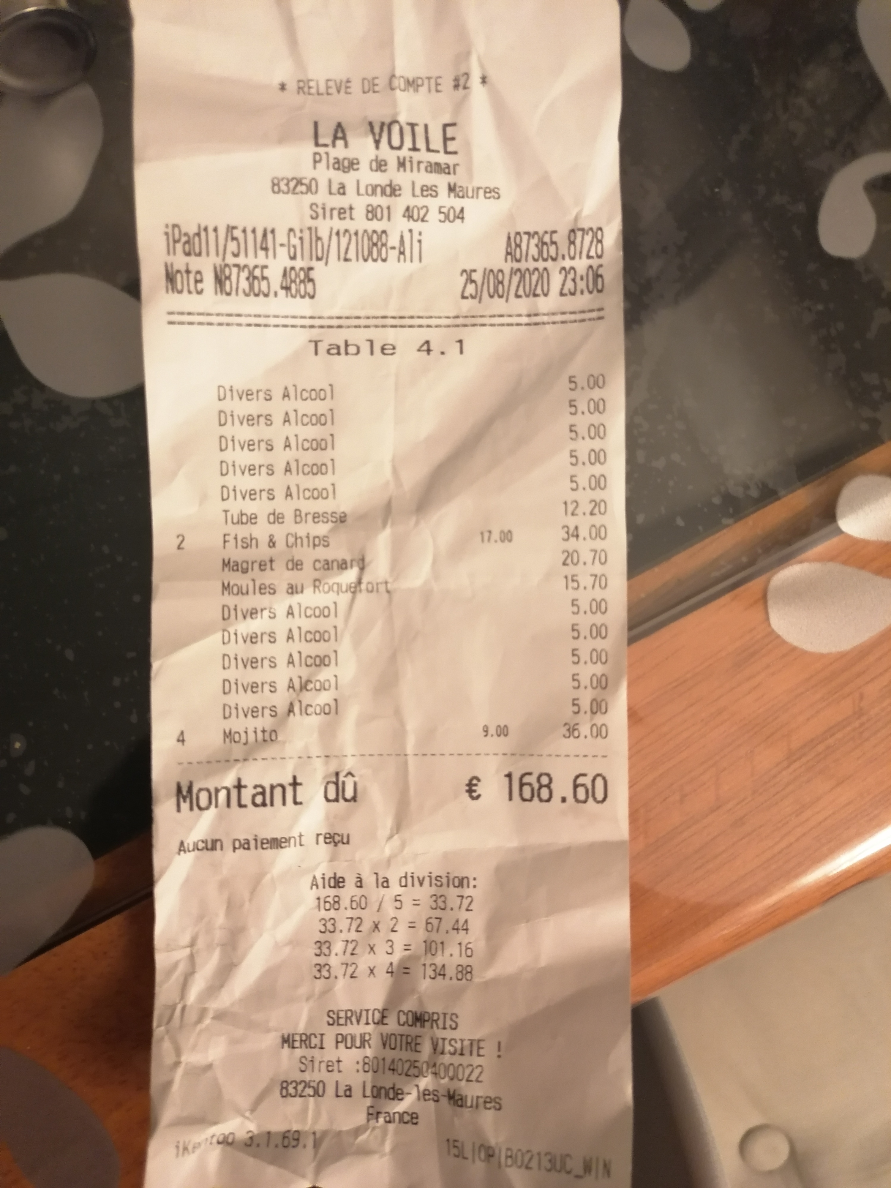 Nous avons vécu une véritable honte ce soir. En effet, nous sommes venus initialement pour la mojito party à 5.00€ Par la suite, nous sommes restés manger. La qualité du repas était très limite... Avec une attente interminable malgré une table sur deux qui était vide. Tout en mangeant entre amis, nous avons continué à commander des mojitos. Lors de l'addition, nous avons eu le plaisir de découvrir que certains mojitos étaient facturés 9.00€ Réponse de la serveuse ( 25/08 vers 23h00 pour la direction ) : c'est comme ça vous payez . Nous avons donc contesté en disant que nous n'avions pas était informé du changement de prix en raison de la fin de l'happy hour. La serveuse nous a répondu que c'était comme ça ( elle nous a prétendue être la responsable de la soirée). Nous lui avons dit qu'après avoir commandé plus d'une dizaine de mojitos ( nous étions 5) et après avoir mangé sur place, le geste était pas beau. C'est à ce moment que le comportement de la serveuse a dérivé ! Elle nous a dit que nous étions inculte et que nous allons payer et partir de suite. Nous n'avons jamais été accueilli comme ça dans un restaurant sur la londe. Les gens autour de nous été choqués du comportement à notre égard. Nous sommes très déçus de la part d'un restaurant de plage où de surcroît nous venons louer des transats et consommons des boissons régulièrement. La serveuse à terminé en disant que le patron serait ravi de nous accueillir demain pour contester d'un air arrogant. Je suis donc plein d'espoir, que la direction de l'établissement nous contacte pour discuter de cette évènement. Ci joint, je ticket de caisse PS : pas de masques lors du service. À vérifier par la direction sur les caméras du restaurant.