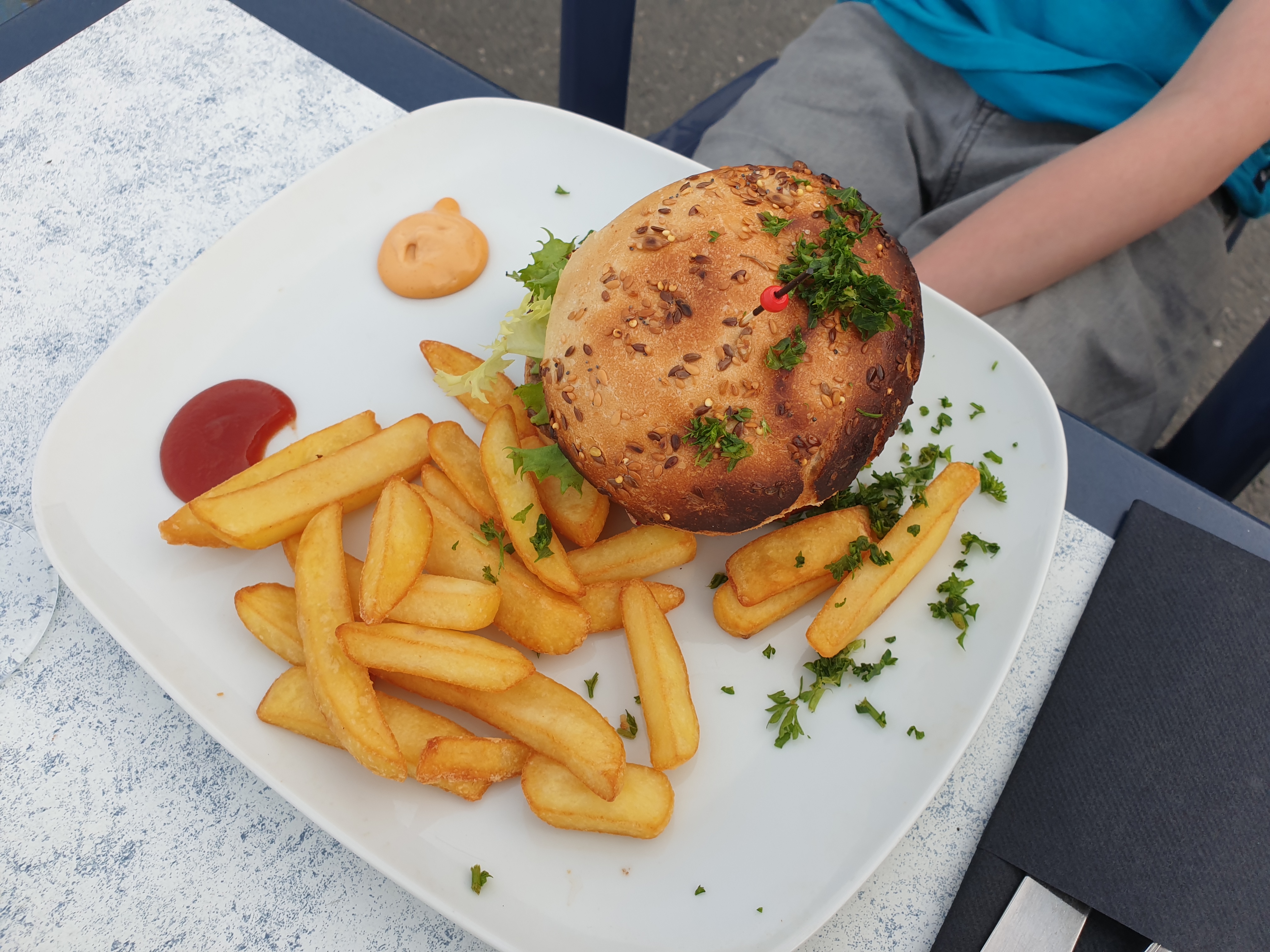 Service minimum, frite, pain, tout est rationnnne. Je ne recommande pas, aller un peu plus loin sur le port, vous serez mieux servi...