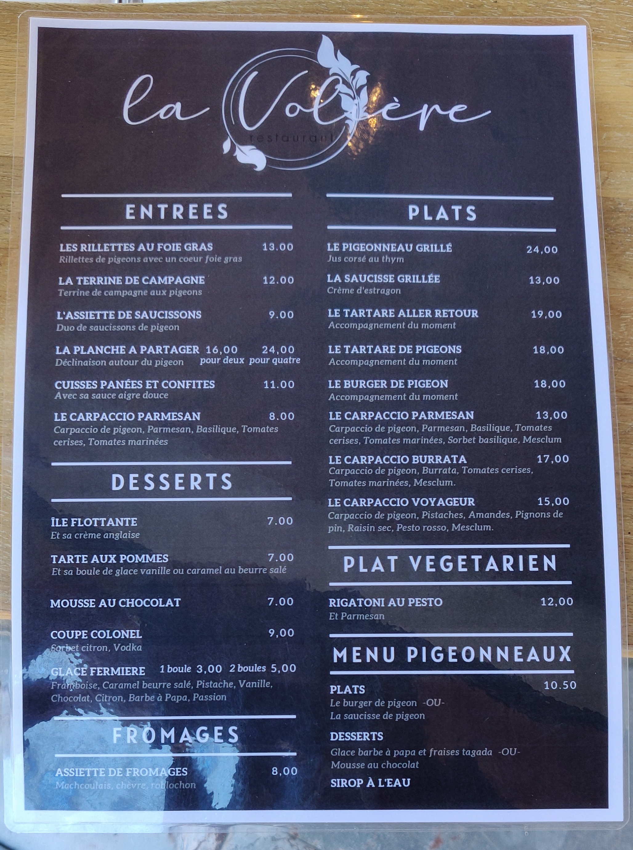 De retour pour la troisième fois chez la volière. Planche apéro top, pigeonneau grillé aux morilles un délice et la saucisse de pigeon à été adorée parcles enfants. A tres bientôt