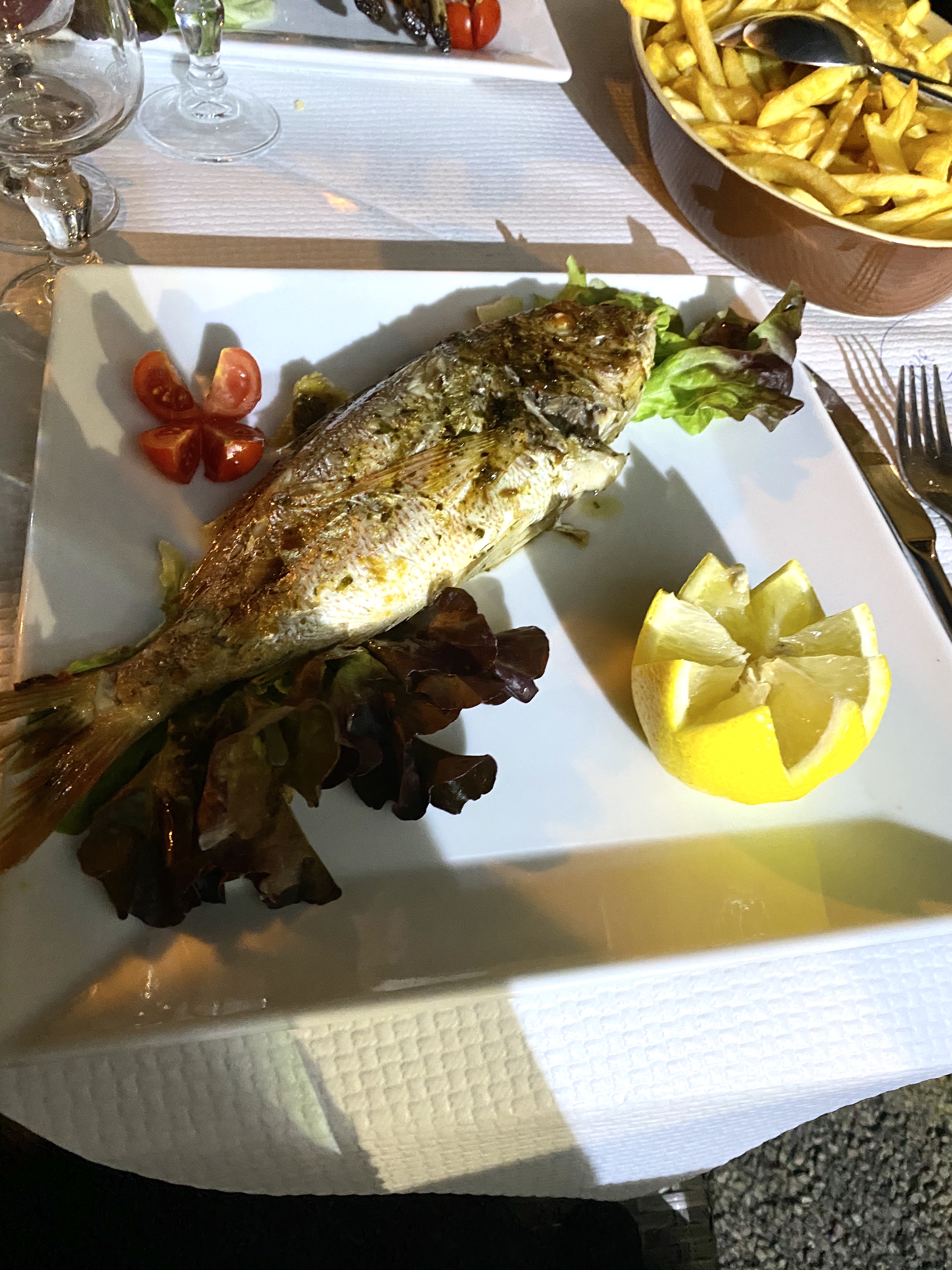 Menu pris dans ce restaurant conseillé par le guide du routard. Le prix est correct pour le secteur. L’originalité est de présenter les poissons afin de choisir celui que nous voulons pour notre plat. Les plats sont copieux, le seul petit reproche serait l’assaisonnement de la soupe de poissons qui n’était pas assez épicé à mon goût, par contre la rouille très bonne. Le plat de résistance était bon ainsi que le dessert ( de présentation simple). La terrasse est sympa et le personnel très agréable ( souriant et service efficace).